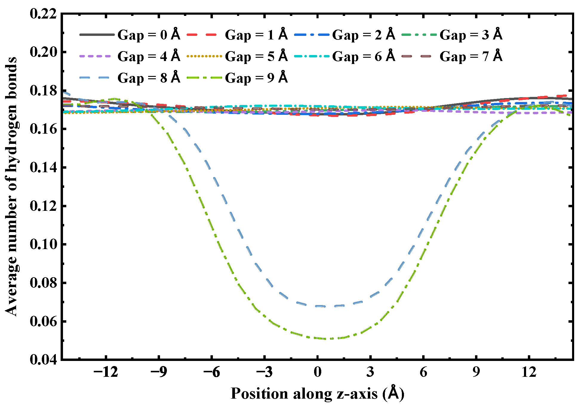 Figure 11, when the gap size ranges from 0 to 7 Å, the hydrogen bond distribution remains consistent across the entire nanotube, including the gap region. However, when the gap size increases to 8 Å or 9 Å, the number of hydrogen bonds within the gap region decreases substantially. Since the structural stability of the single-file water chain within the (6,6) SWCNT is primarily determined by the intermolecular hydrogen bond network, this indicates that beyond a gap size of 7 Å, the water chain is unable to bridge the gap and maintain a continuous hydrogen bond network, resulting in a loss of structural integrity and subsequent rupture of the chain.