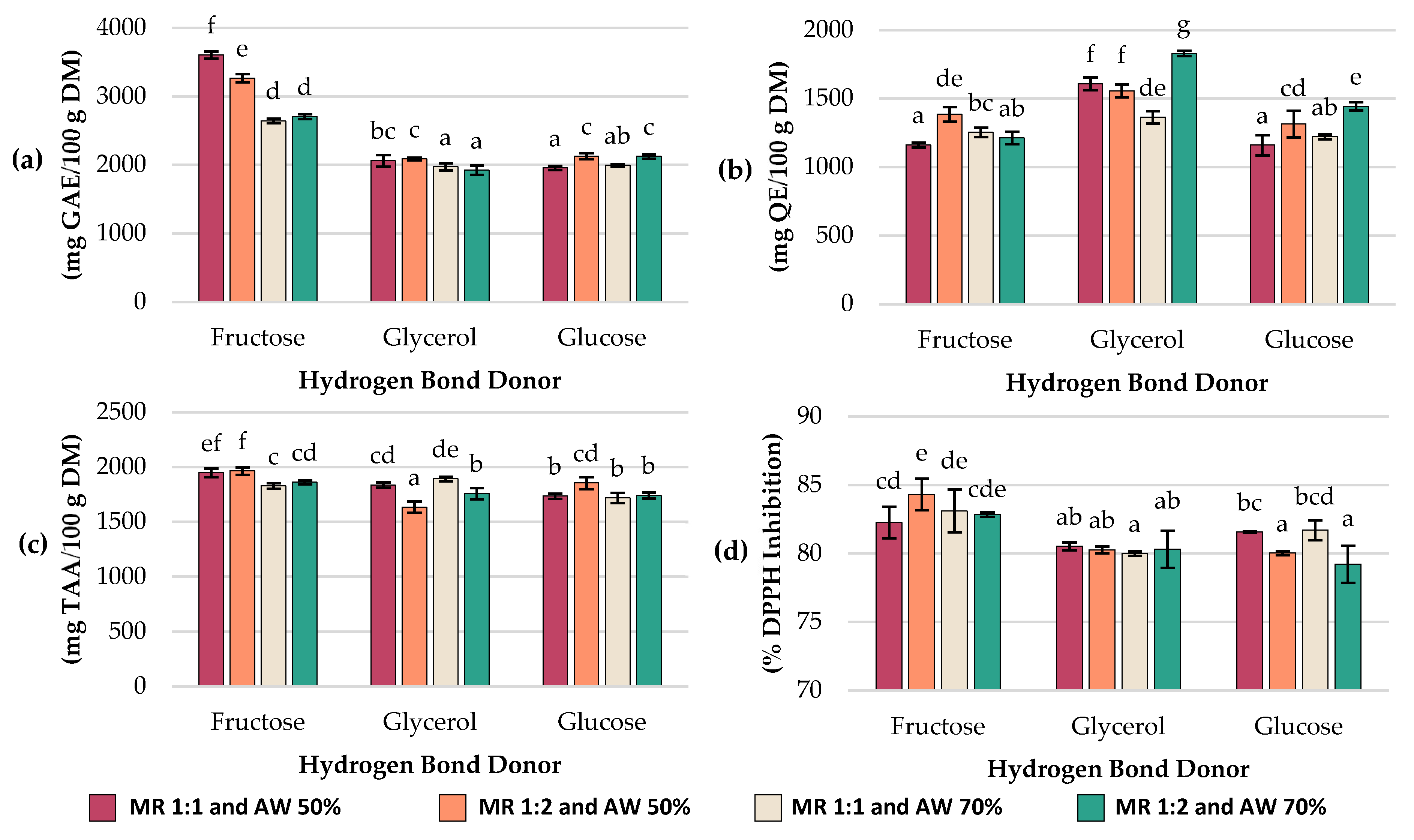 Figure 1c). The highest concentrations were obtained using fructose as HBD in Exp #4 (MR 1:2 mol/mol and AW 50%) with 1964.9 ± 33.7 mg/100 g DM and Exp #1 (MR 1:1 mol/mol and AW 50%) with 1948.2 ± 38 mg/100 g DM, while the lowest was observed with glycerol-based NADESs in Exp #5 (MR 1:2 mol/mol and AW 50%), reaching 1635.2 ± 52.8 mg/100 g DM. In general, extracts obtained with fructose yielded higher ascorbic acid values (1828.5–1964.8 mg/100 g DM) compared to those obtained with glucose (1719.5–1854.9 mg/100 g DM) and glycerol (1635.3–1892.5 mg/100 g DM). For fructose- and glucose-based NADESs, increasing the molar ratio from 1:1 to 1:2 mol/mol at 50% AW slightly enhanced ascorbic acid recovery, whereas in glycerol-based NADESs, this change did not result in an improvement. Regarding the effect of water added, decreasing AW to 50% increased ascorbic acid content in fructose-based NADESs, whereas in glycerol-based NADESs, the opposite trend was observed, with lower TAA values at lower water content.