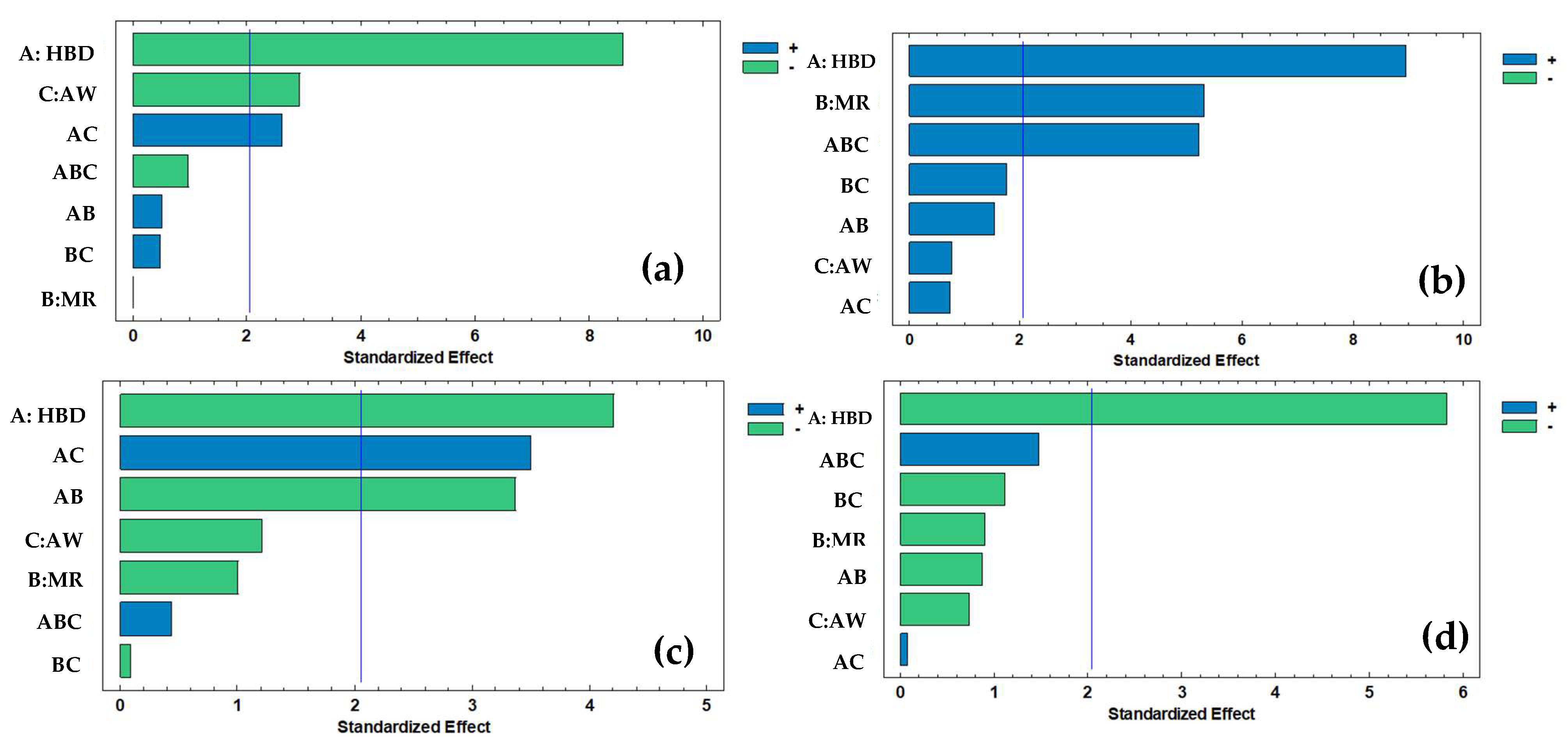 Figure 2a), HBD (A) presented the largest standardized effect, followed by AW (C) and their interaction (AC).