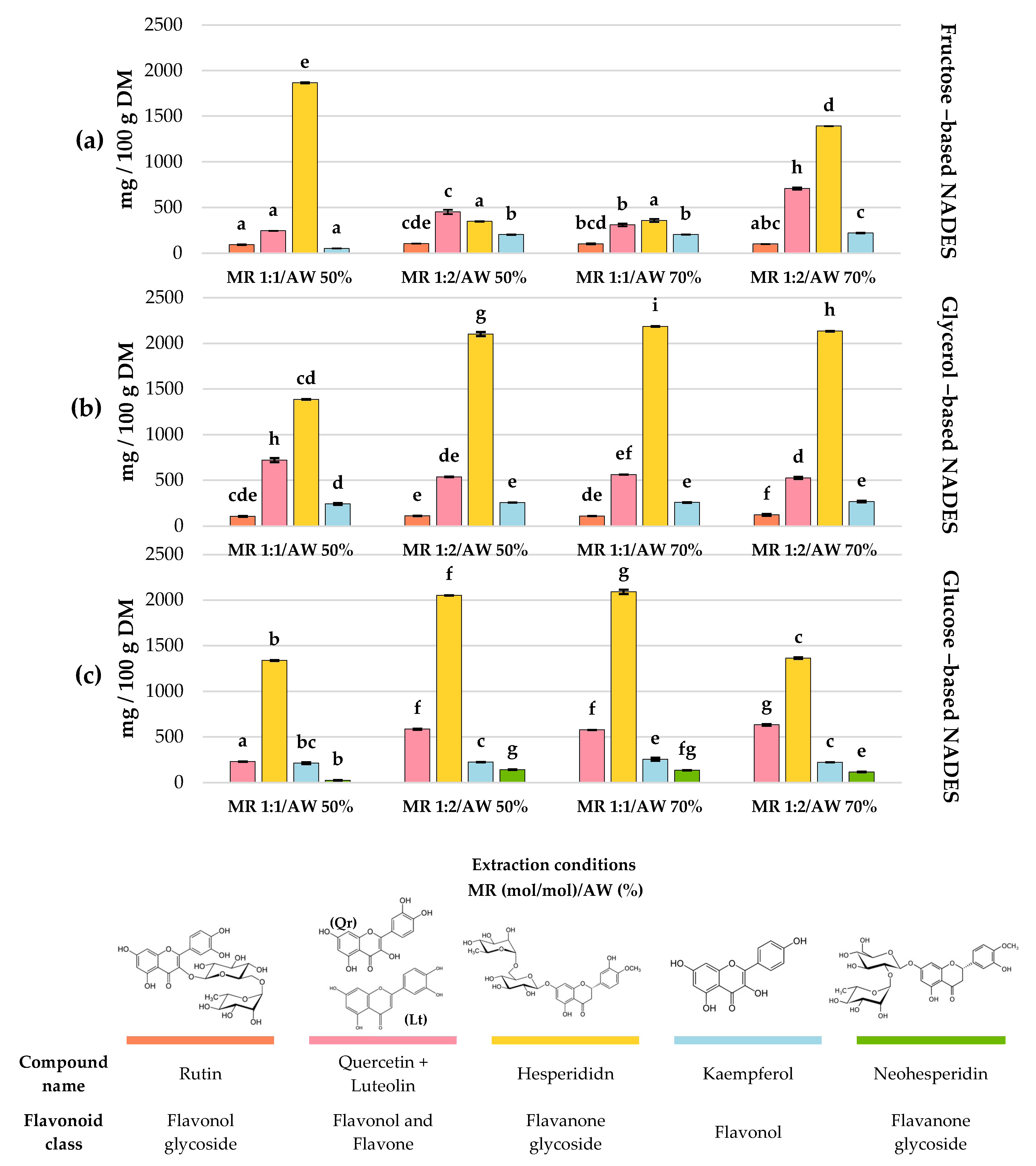 p > 0.05). Extracts obtained from glycerol-based NADESs showed the highest flavonoid content (1363.4–1829.8 mg QE/100 g DM), compared to those prepared with fructose (1161.4–1385 mg QE/100 g DM) or glucose (1159.6–1443.8 mg QE/100 g DM).