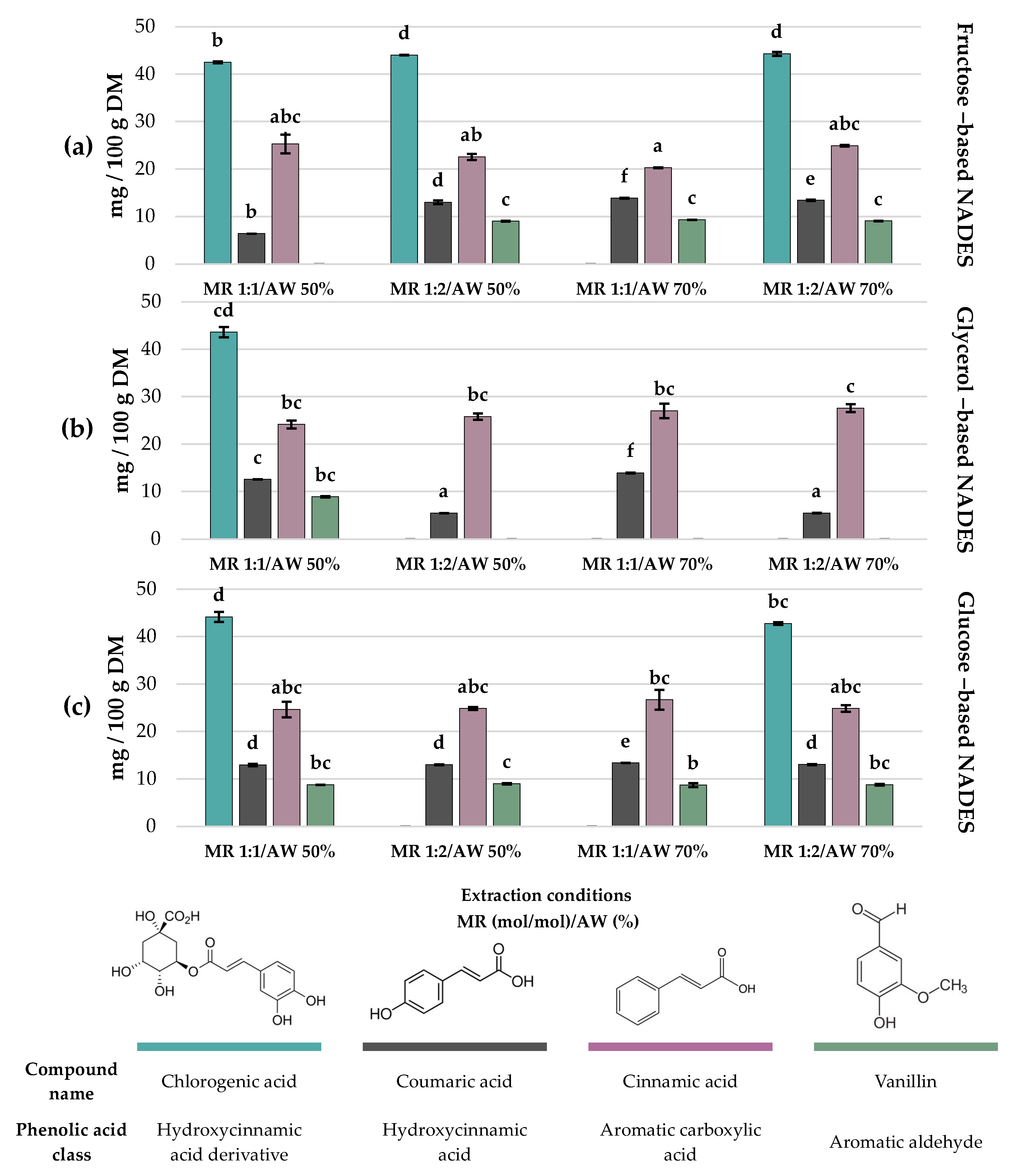 Regarding vanillin, its extraction was limited to specific treatments. The highest concentration was obtained with fructose-based NADESs, specifically Exp #4 (MR 1:2 mol/mol and AW 50%), Exp #7 (MR 1:1 and AW 70%), and Exp #10 (MR 1:2 and AW 70%), with values of 9.02 ± 0.10, 9.32 ± 0.01 and 9.07 ± 0.06 mg/100 g DM, respectively (p > 0.05). In general, fructose and glucose as HBDs favored the extraction of chlorogenic acid and vanillin, whereas glycerol-based NADESs were less efficient for these specific compounds but still enabled the recovery of cinnamic acid at comparable levels.