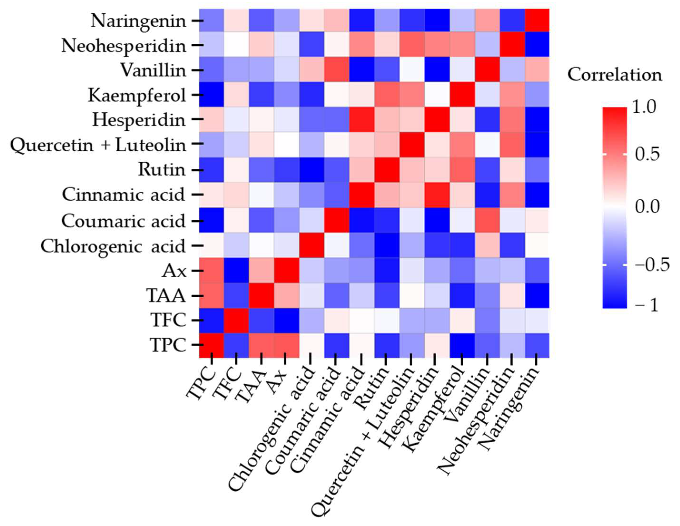 A positive correlation was observed between TPC and TAA (r = 0.7120), as well as between TPC and Ax (r = 0.7275). Additionally, some individual polyphenols displayed strong associations, such as hesperidin with cinnamic acid (r = 0.9108) and vanillin with coumaric acid (r = 0.7559). In contrast, certain secondary metabolites exhibited negative correlations; for instance, naringenin with kaempferol (r = −0.8021) and naringenin with cinnamic acid (r = −0.7211). Overall, most correlations showed no statistical relevance, with coefficients below 0.7.