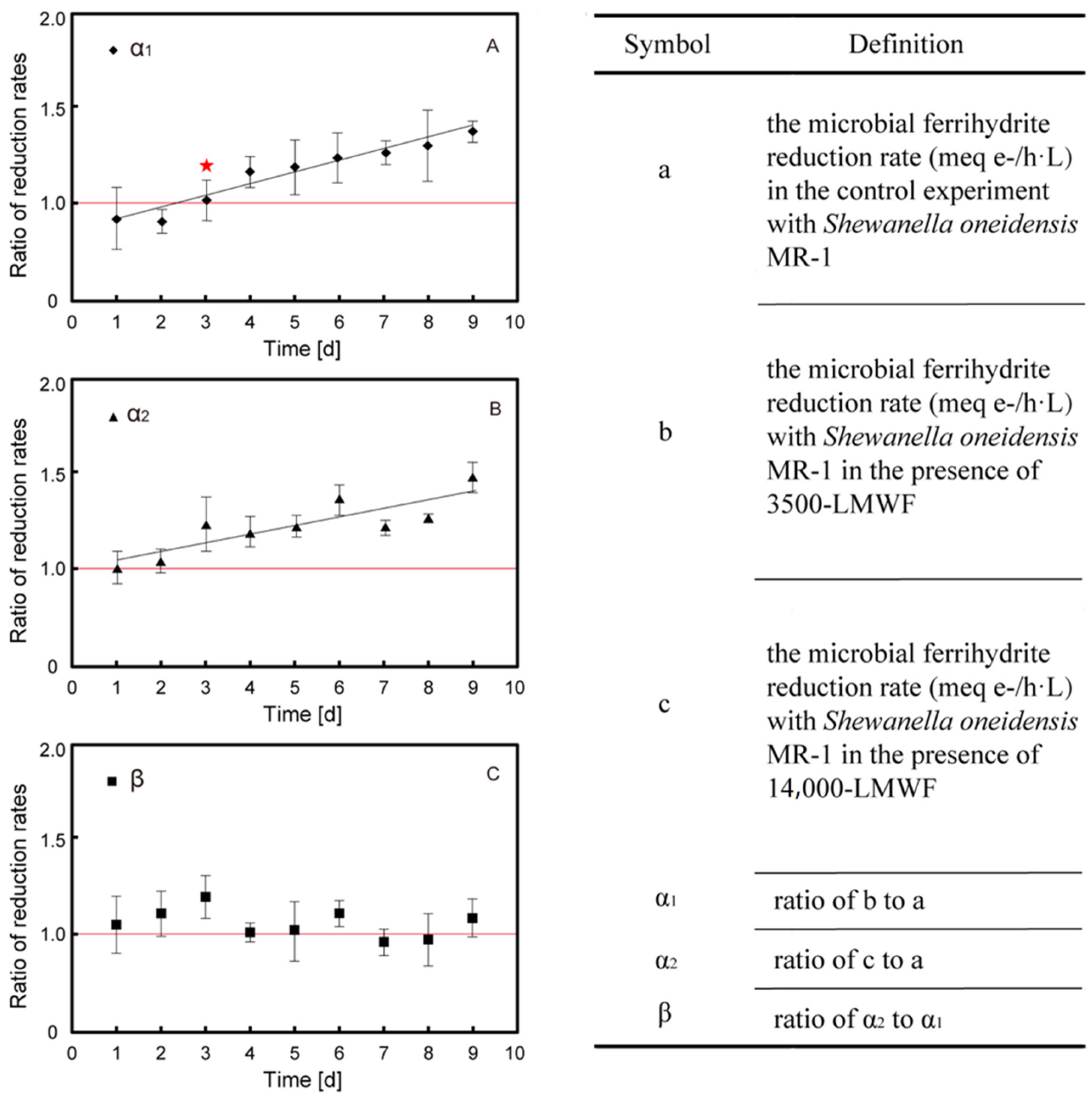 Figure 1C). The β value fluctuated around one independence of dialysis time. It is indicated that the LMWF with molecular weight between 3500 and 14,000 Da could barely stimulate the reduction, and 3500-LMWF LHA is the main contributor to accelerated microbial reduction in ferrihydrite.