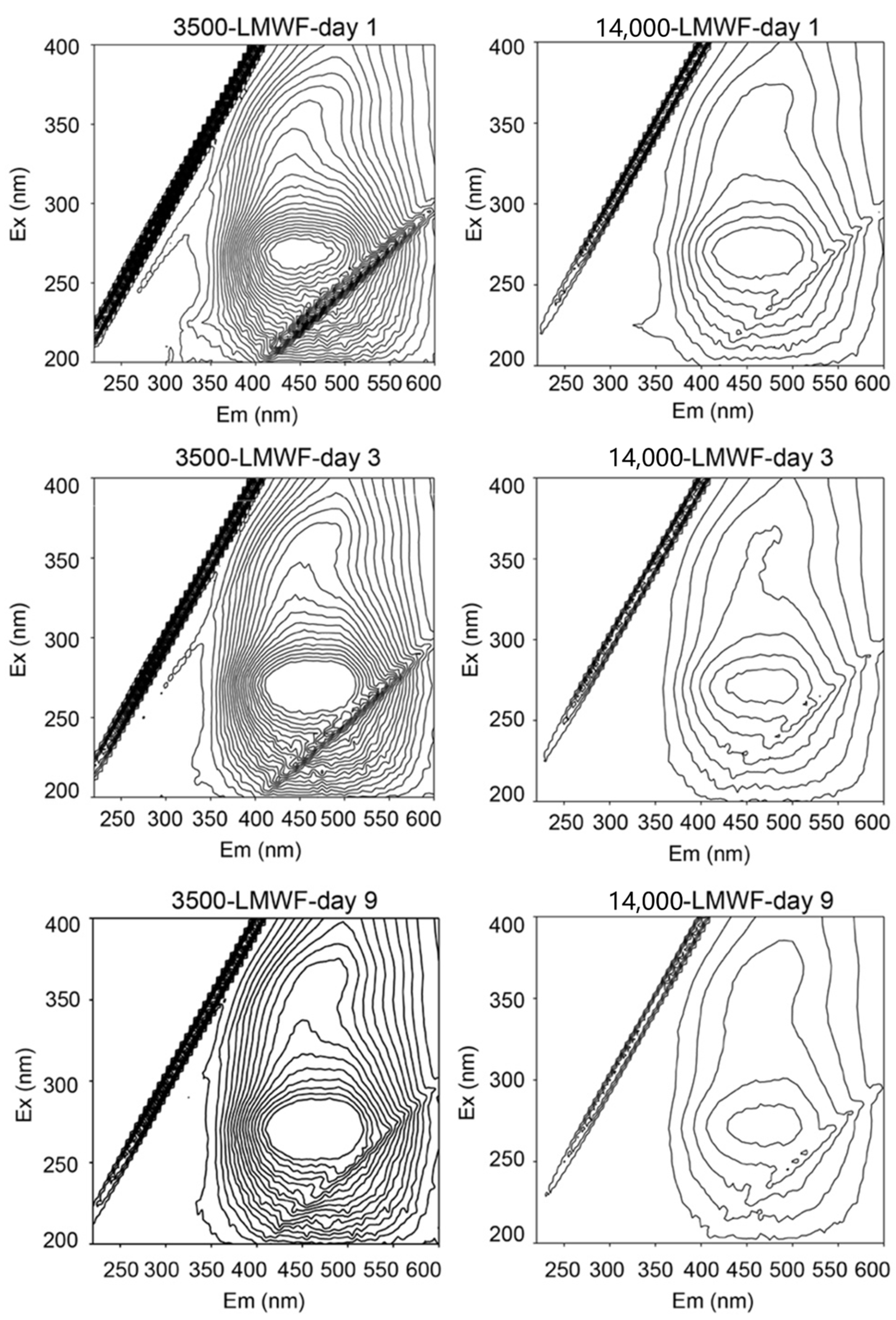 Figure 2 include protein-like fluorophores including tryptophan-like peak (Ex: 270–280 or <240 nm; Em: 330–368 nm) and a tyrosine-like peak (Ex: 270–275 nm; Em: 304–312 nm) and humic-like fluorophores (Em > 400 nm). Specifically, humic-like fluorophores are related to quinone groups. When the wavelength is greater than 400 nm, Ex wavelength at 250–300 nm and 330–400 is caused by quinonoid π-π* transition. For all of LMWF samples, major quinone-like fluorophores and minor protein-like fluorophores were detected. Higher relative fluorescence intensities were detected in quinone-like fluorophores (1.13–1.96 a.u.,