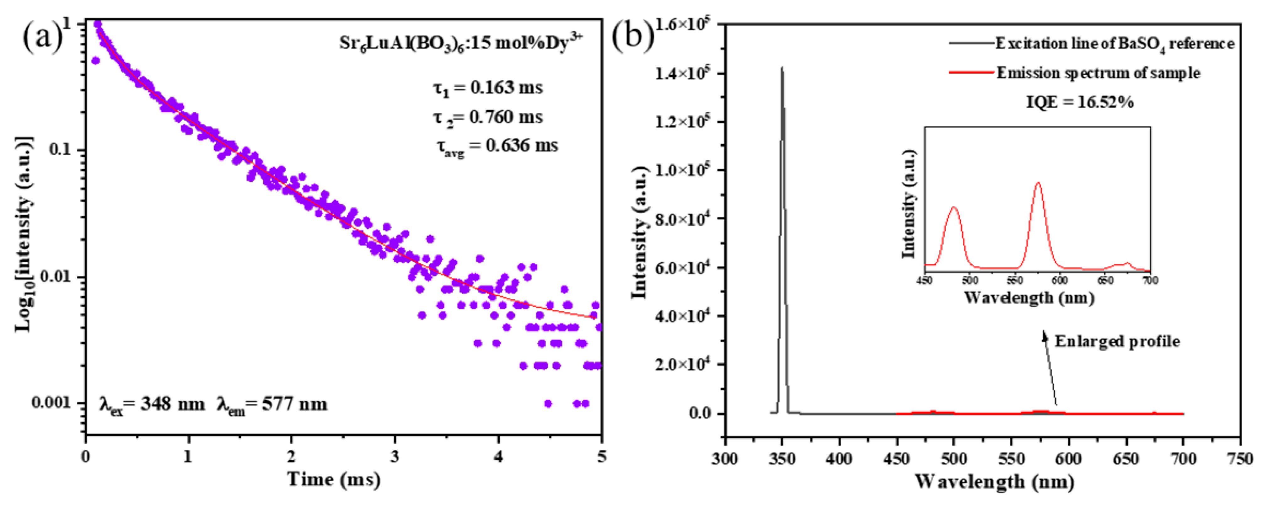 - Zhang, A.; Yang, Y.; Peng, Y.; Zhou, H.; Tang, W.; Jiang, J.; Wu, Y.; Cai, S.; Xie, L.; Deng, B. Synthesis of Sr6LuAl(BO3)6:Sm3+ Red Phosphor with Excellent Thermal Stability and Its Application in w-LEDs. Molecules 2024, 29, 5495. [Google Scholar] [CrossRef]