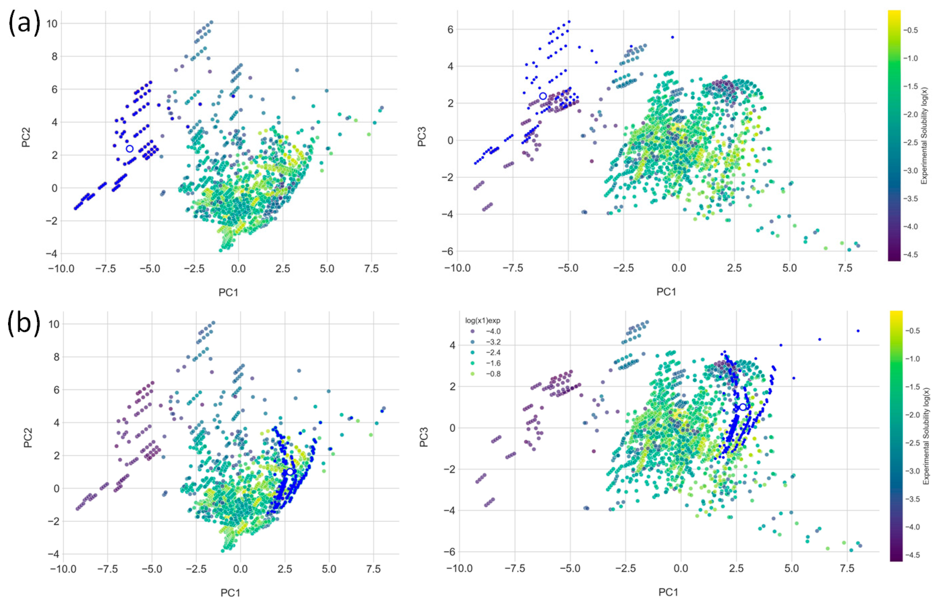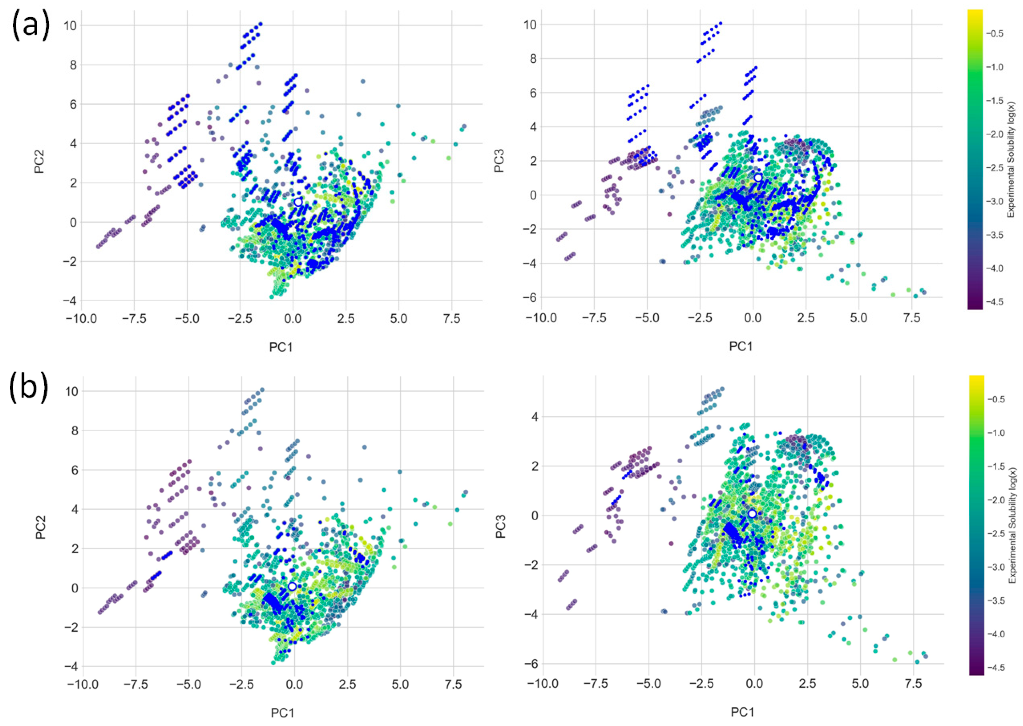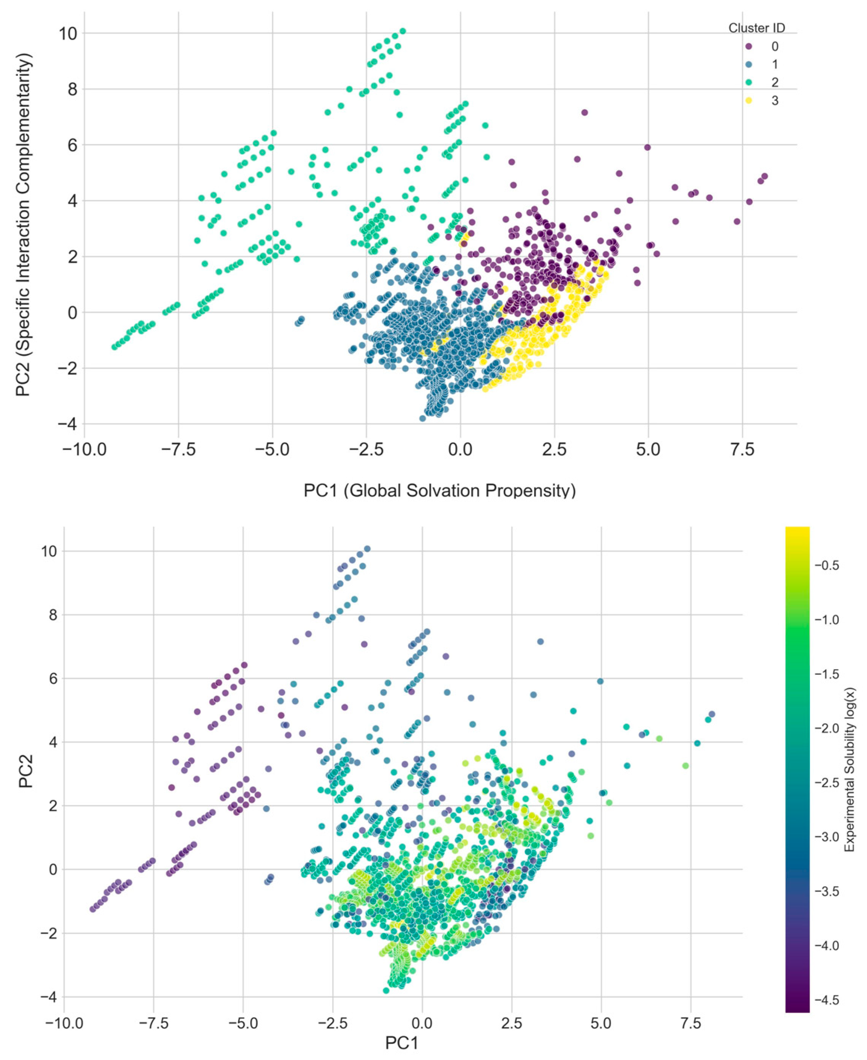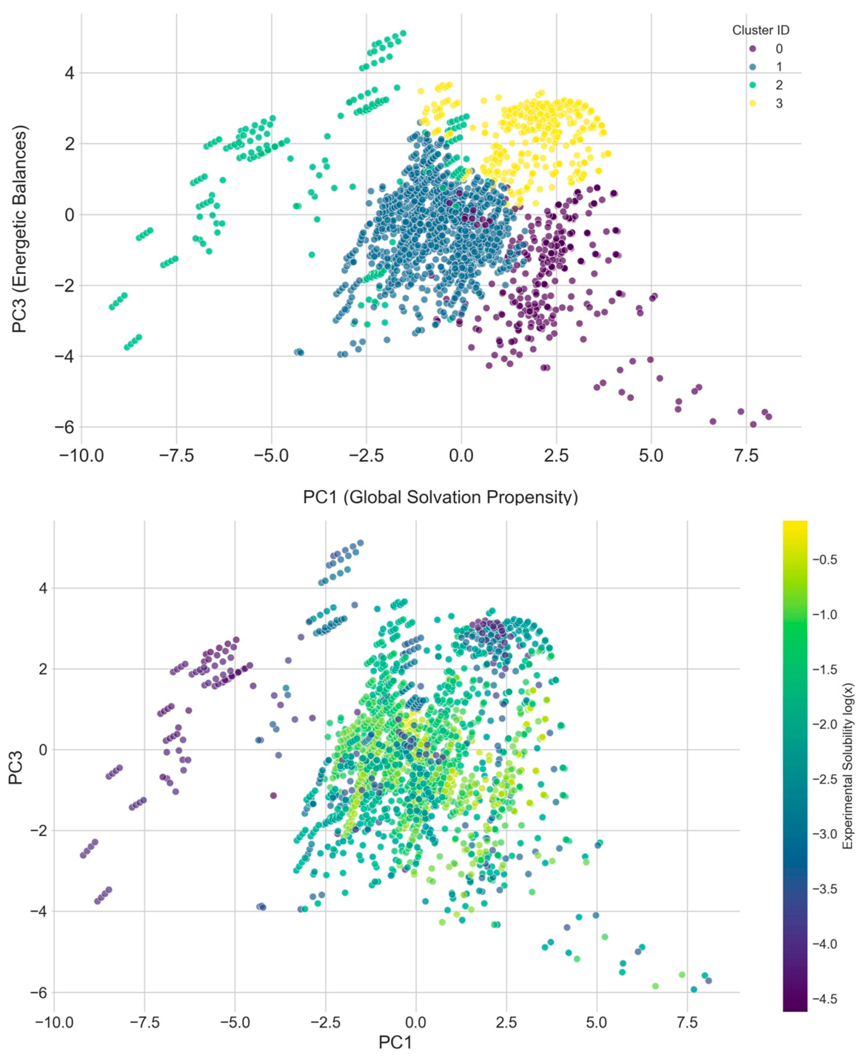 - Two low-solubility regions are clearly distinguished: (i) high PC1 with low PC3 (Cluster 0), where crystalline lattice effects dominate, and (ii) low PC1 across any PC3 (Cluster 2), where poor global solvation is the bottleneck.
