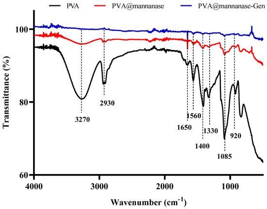 FTIR spectra of PVA, PVA@mannanase, and PVA@mannanase-Gen at 500–4000 cm−1.