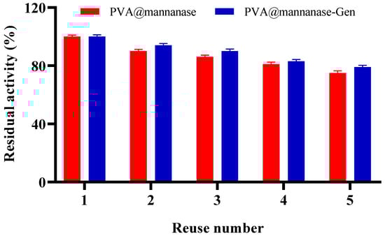 Figure 5 shows the operational stability of PVA@mannanase and PVA@mannanase-Gen for five consecutive reuses. The residual activity of both PVA@mannanase and PVA@mannanase-Gen slightly decreased with an increasing reuse number. After five reuses, the residual activities were 75% and 79% of the initial activity of PVA@mannanase and PVA@mannanase-Gen, respectively. This decrease in biocatalyst activity may be due to enzyme inactivation, the loss of some biocatalyst mass after each reuse in the filter, enzyme release from the biocatalyst, or the accumulation in the beads of some substances that can act as enzyme inhibitors. In the case of PVA-based hydrogels, an additional factor may be the partial clogging of pores by the large LBG substrate and intermediate hydrolysis products, which can create diffusion barriers and progressively restrict substrate access to the immobilized enzyme during repeated cycles. Chen et al. [60] reported that CaAlg maintained 70.34% of its initial activity after eight reuses. MB-C and MB-Mag-C were used to hydrolyze LBG for 12 cycles, and MB-C and MB-Mag-C retained 31.08% and 8.6% of their initial activities at the end of 12 cycles [25]. Dhiman et al. demonstrated that 70% of the residual activity was retained after 15 repeated cycles for β-mannanase immobilized on the modified matrix of sodium alginate-grafted β-cyclodextrin [28]. Sadaqat et al. [27] reported that β-mannanase immobilized on glutaraldehyde crosslinked chitosan beads remained at 70% of its initial activity after 15 uses. Compared with the examples in the literature, PVA@mannanase and PVA@mannanase-Gen have a good reusability.