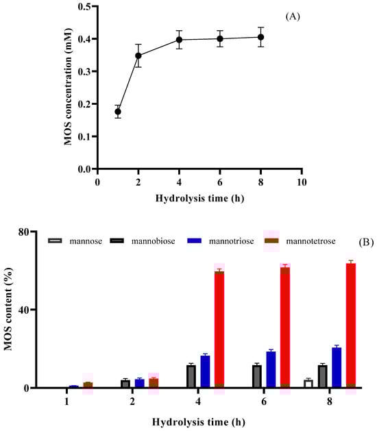 The time-course hydrolysis of LGB (0.25%, w/v) catalyzed by PVA@mannanase-Gen at pH 5.0 and 55 °C. The amount of formed MOSs (A) and MOS products (B). All experiments have been repeated in triplicate.