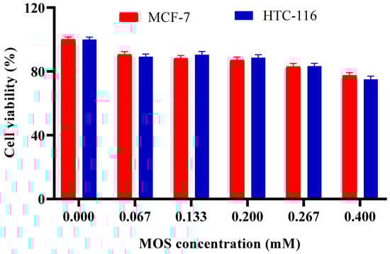 Effect of MOS concentration on viability of MCF-7 and HCT-116 cell lines. Other specifications may be found in the Methods section. All experiments have been repeated in triplicate.