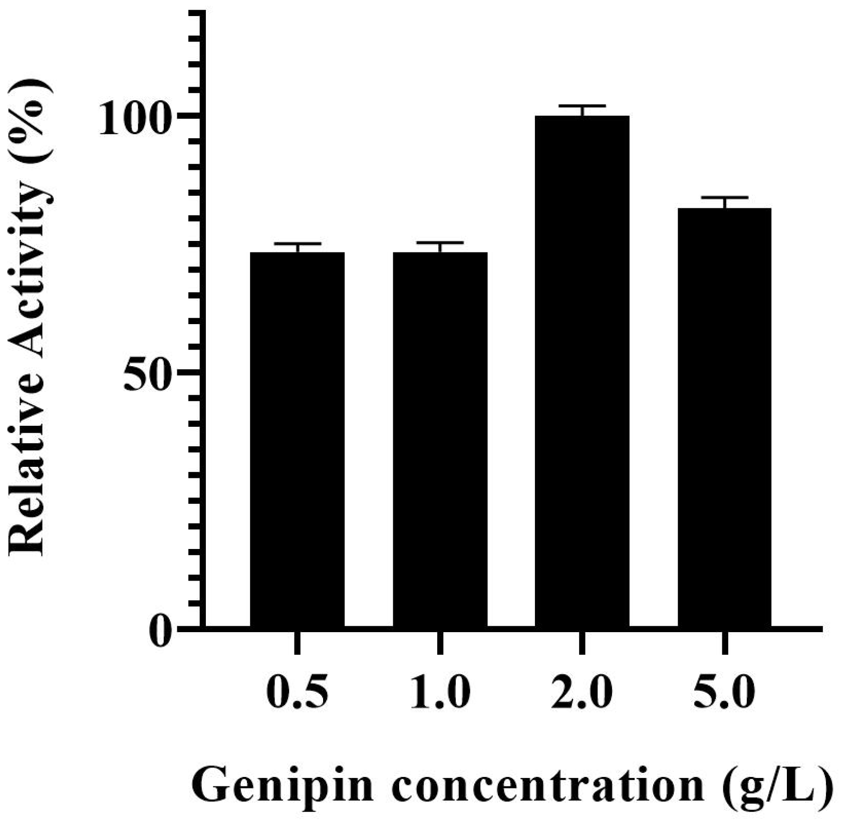 Figure 1. Effect of genipin concentration on the activity of PVA@mannanase-Gen. All experiments have been repeated in triplicate. Experiments were performed as described in the Methods section.