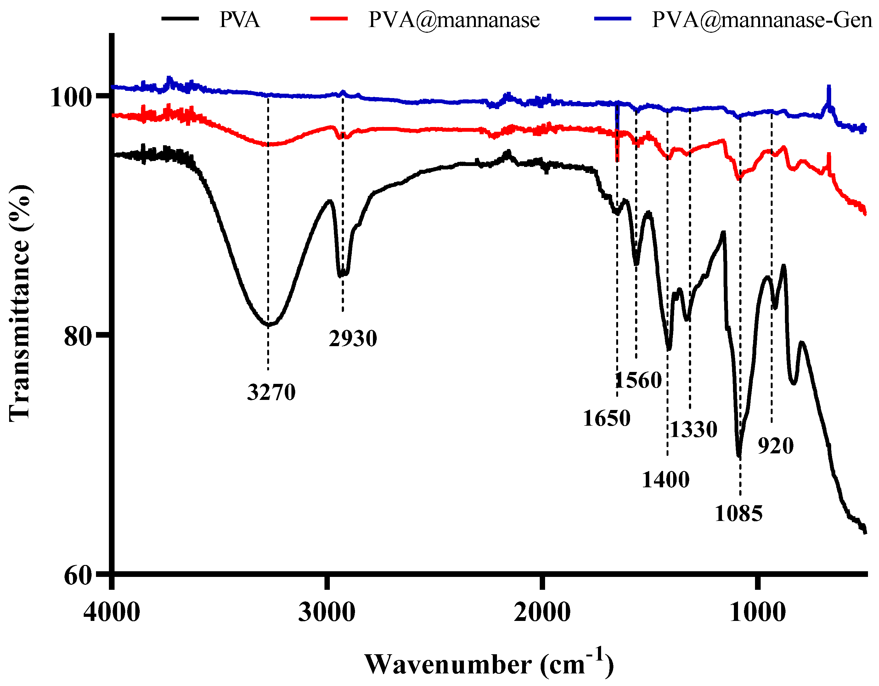 Figure 2. FTIR spectra of PVA, PVA@mannanase, and PVA@mannanase-Gen at 500–4000 cm−1.