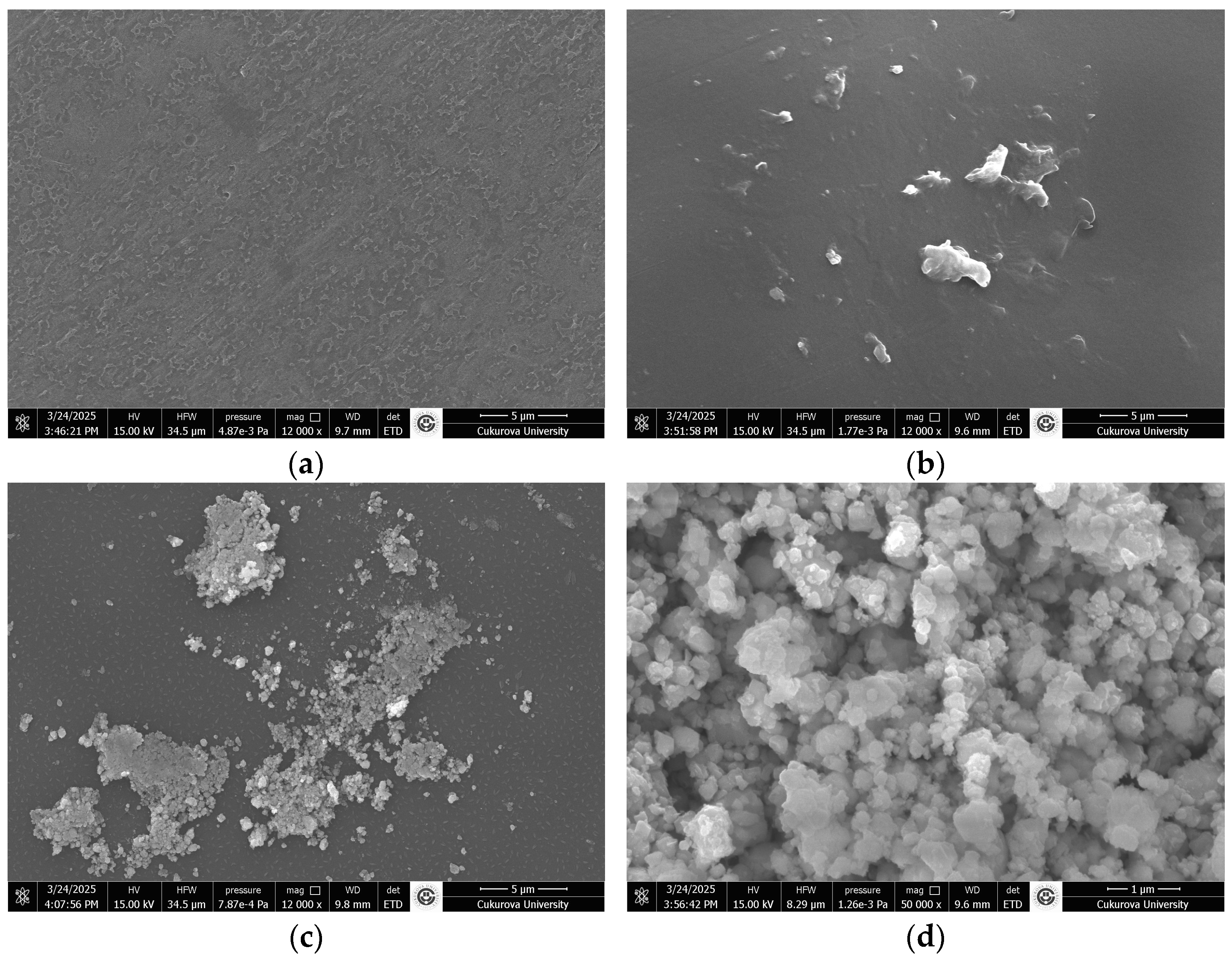 The surface morphology of PVA (control), PVA@mannanase, and PVA@mannanase-Gen was examined using scanning electron microscopy (SEM, Quanta 650 Field Emission SEM). To reduce charging effects, the samples were coated with a thin gold layer. The SEM was operated at 15 kV, and images were captured at various magnifications ranging from 5000× to 50,000×.