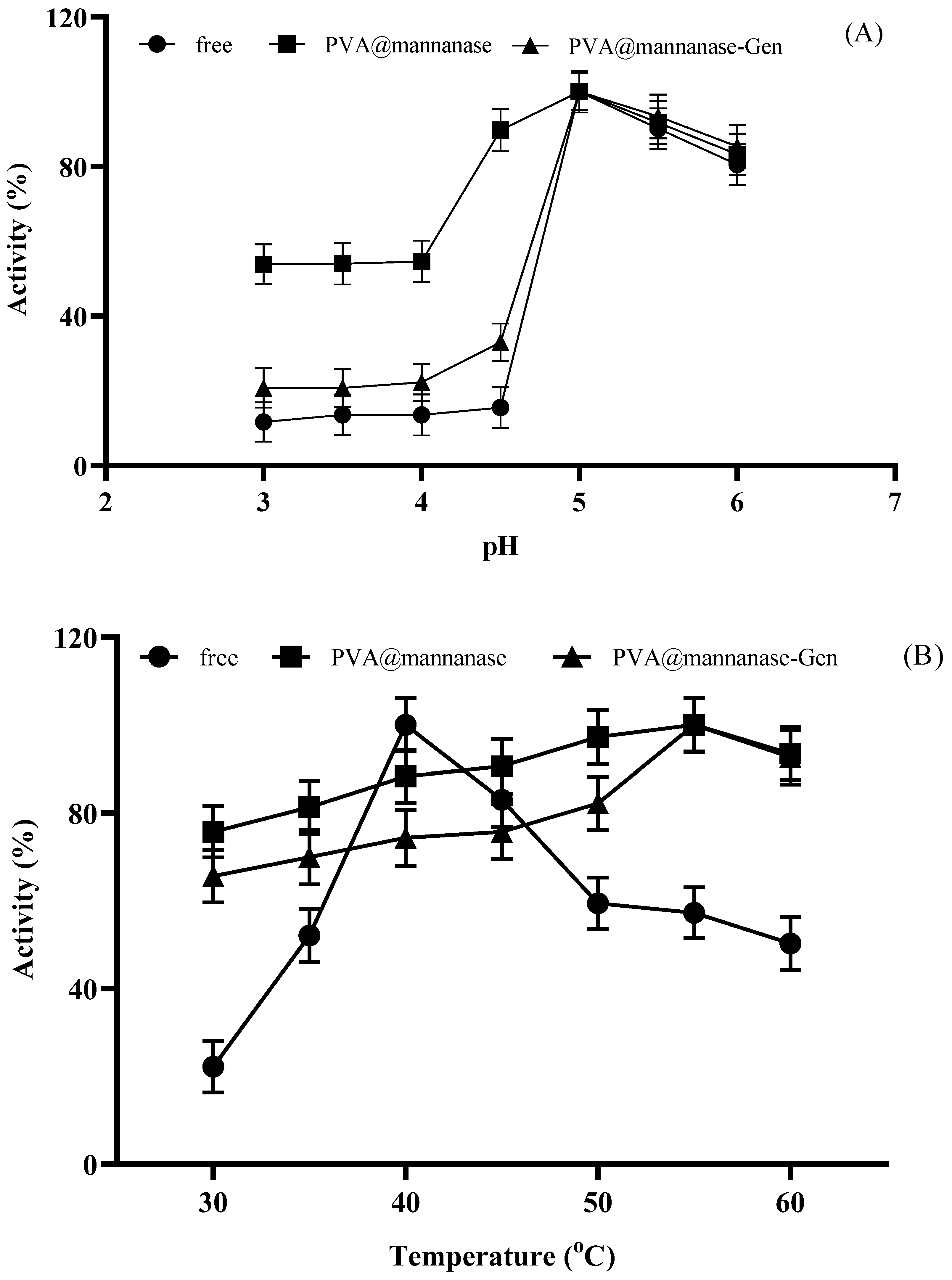 As illustrated in Figure 4B, the highest activity of free β-mannanase at pH 5.0 was determined at 40 °C, whereas the highest activities of PVA@mannanase and PVA@mannanase-Gen were both at 55 °C. Notably, the activities of PVA@mannanase and PVA@mannanase-Gen were less affected by the temperature change compared to the free enzyme in the temperature range of 30–60 °C, highlighting the protective benefits of the immobilization process for the mannanase activity. The optimum pH for both forms of the Man/Cel5B enzyme was found to be pH 5.5. The optimum pH and temperature of both free β-mannanase and its immobilized form on the zinc oxide nanoparticle were 6.0 and 40 °C, respectively [29]. Blibech et al. [65] reported that the optimal pH of β-mannanase produced from five soil-derived Bacillus strains was 5.0, and the optimal temperature was in the range of 50–70 °C. Zhao et al. [66] found that the optimal pH and temperature of β-mannanase purified from Lactobacillus casei HDS-01 were 5.0 and 40 °C, respectively.