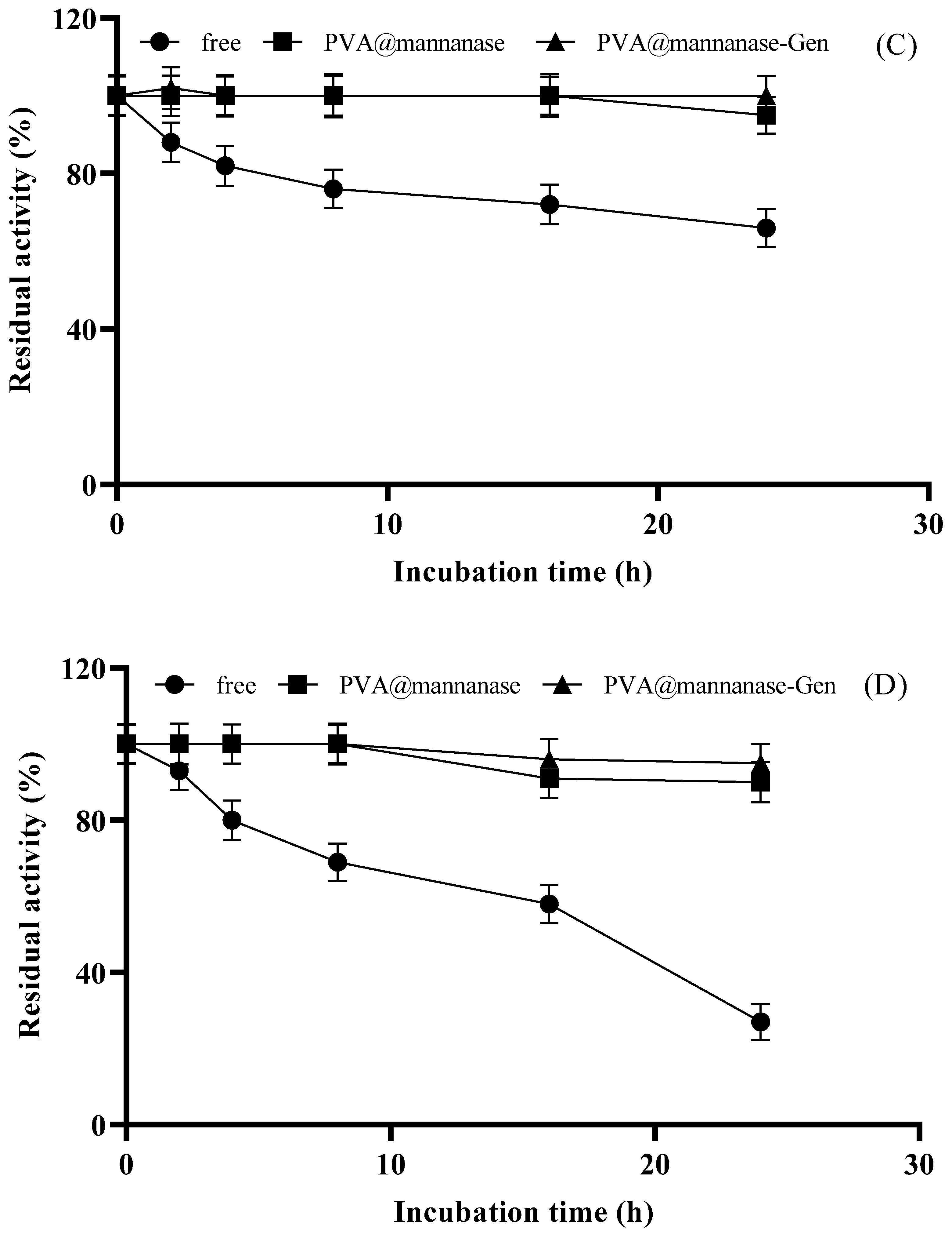 Next, the thermal stability of free mannanase, PVA@mannanase, and PVA@mannanase-Gen was examined at 40 °C and 55 °C for 24 h (Figure 4C,D). The results indicated that PVA@mannanase and PVA@mannanase-Gen retained 95% and 100% of their initial activity after 24 h of incubation at 40 °C. However, the retained activity for the free mannanase was 66% of its initial activity under the same conditions. At 55 °C, the activity of free mannanase decreased significantly, and the retained activity was approximately 27% after 24 h of incubation. However, PVA@mannanase and PVA@mannanase-Gen remained almost fully active after this incubation (90% and 95%, respectively). These findings clearly demonstrate that the immobilized β-mannanase exhibits enhanced stability. This also may explain the significant increase in the optimal temperature at pH 5.0 detected for these immobilized biocatalysts. Moreover, the modification of PVA@mannanase with genipin resulted in a new increase in thermal stability, perhaps by achieving an inter-molecular crosslinking. Shalaby et al. [24] immobilized partially purified mannanase from Penicillium chrysogenum in calcium alginate beads and reported that the immobilized mannanase was about 2-fold more thermostable than the free mannanase at 70 °C. Anderson et al. [67] showed that the retained activities of both the free and immobilized mannanase were similar after 10 h incubation at 60 °C (approximately 75%).