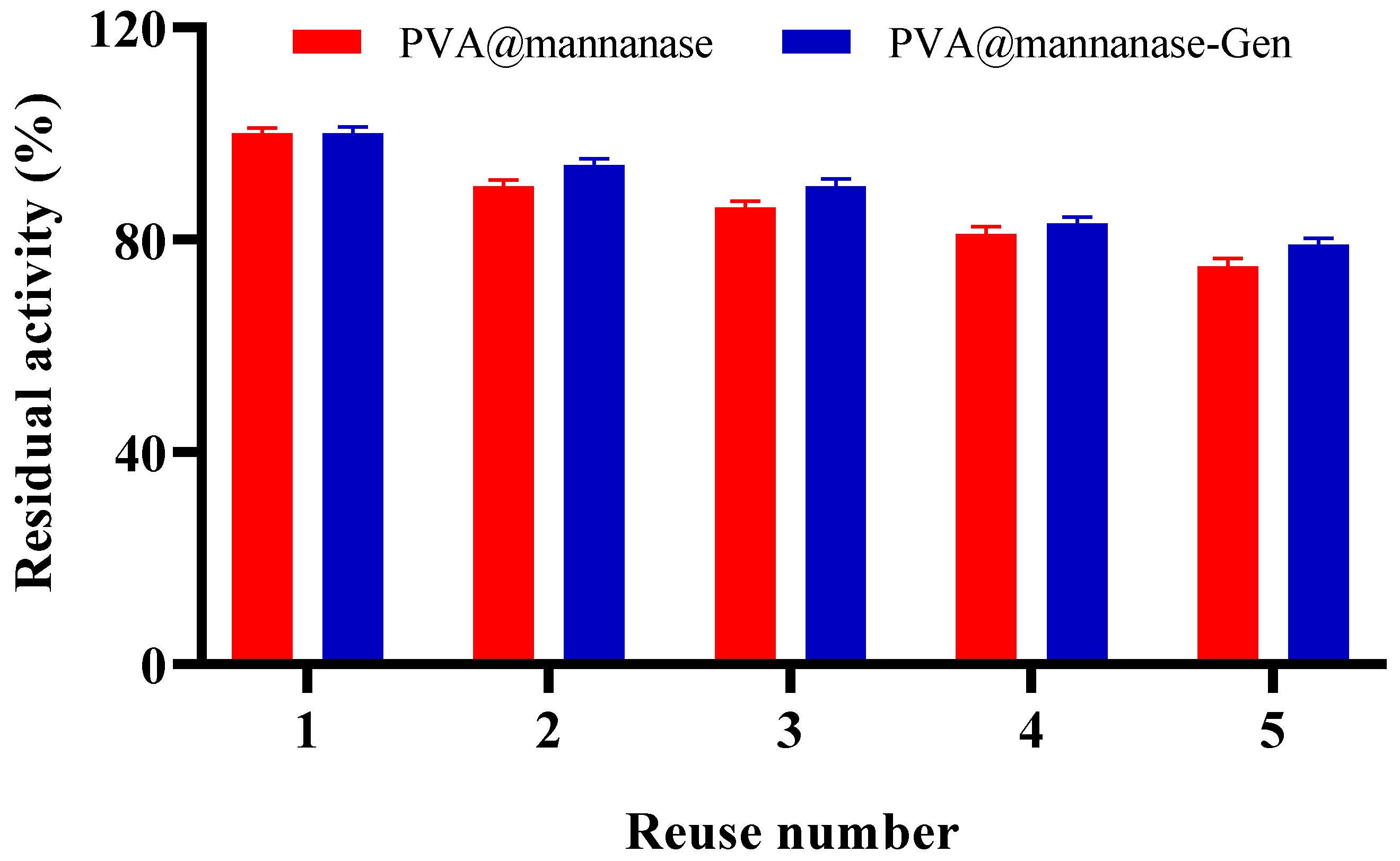 Figure 5. Reuse stability of PVA@mannanase and PVA@mannanase-Gen at pH 5.0 and 55 °C. All experiments have been repeated in triplicate. Other specifications may be found in the Methods section.