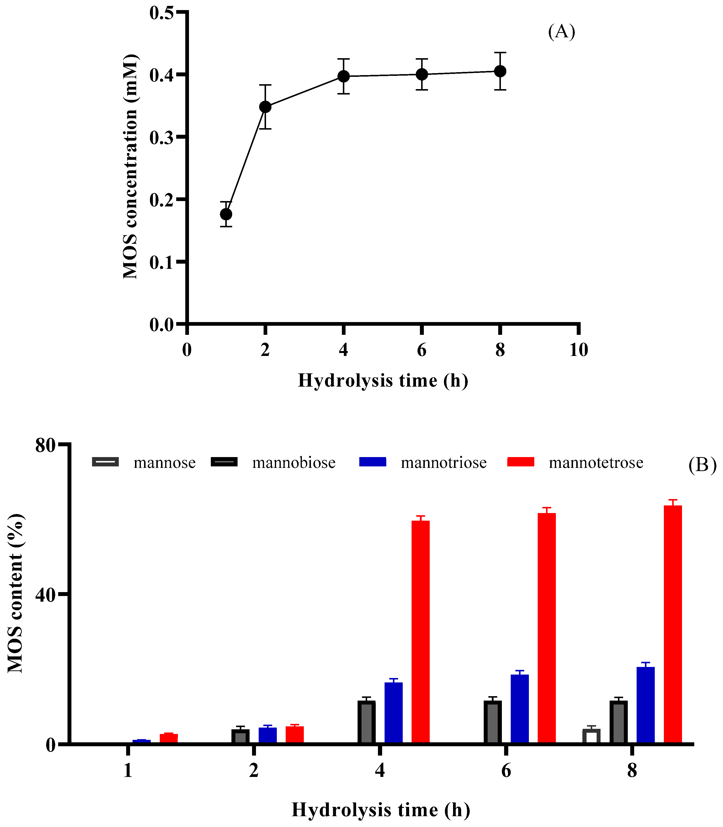 Figure 6. The time-course hydrolysis of LGB (0.25%, w/v) catalyzed by PVA@mannanase-Gen at pH 5.0 and 55 °C. The amount of formed MOSs (A) and MOS products (B). All experiments have been repeated in triplicate.