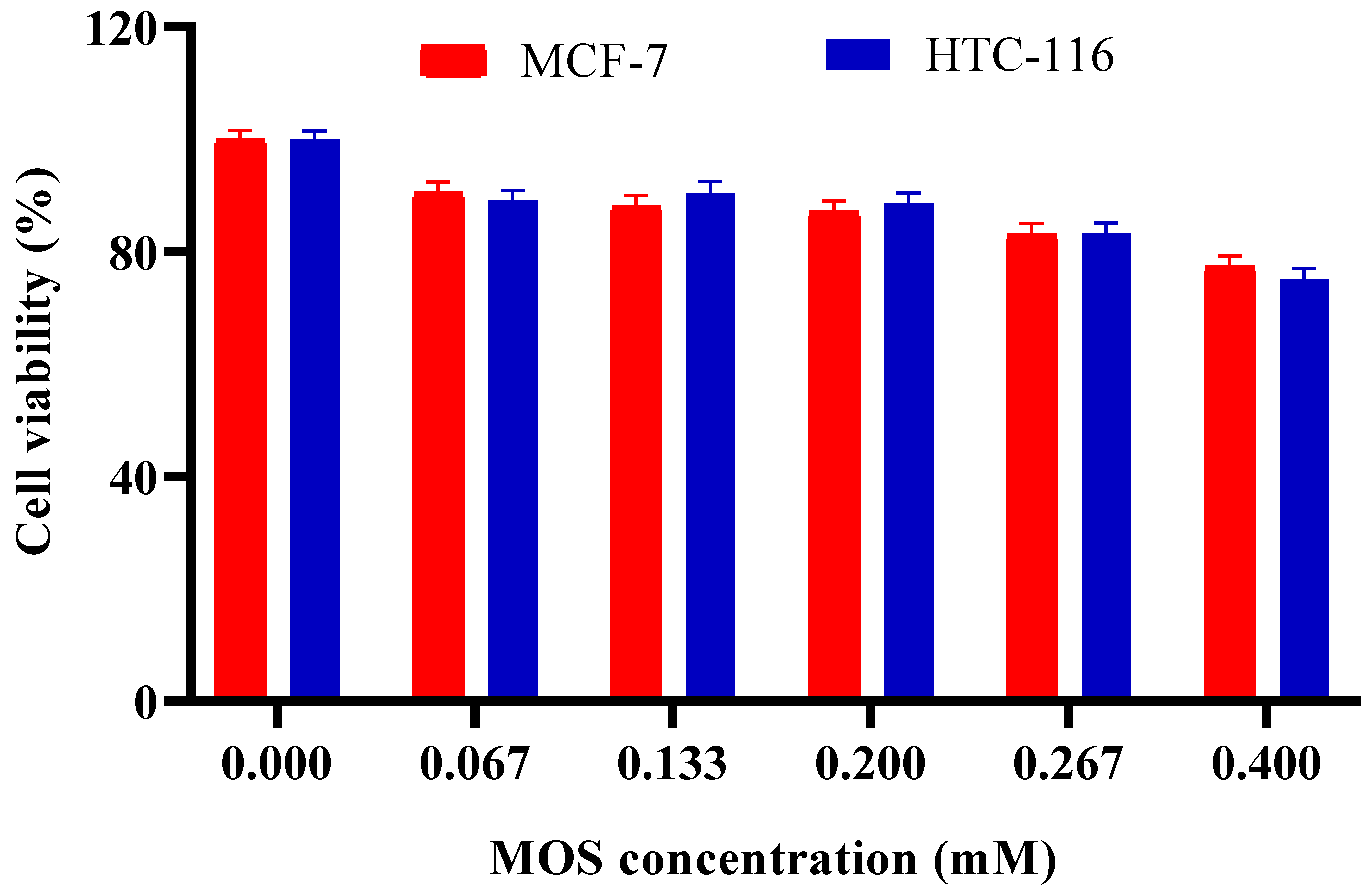 Figure 7. Effect of MOS concentration on viability of MCF-7 and HCT-116 cell lines. Other specifications may be found in the Methods section. All experiments have been repeated in triplicate.