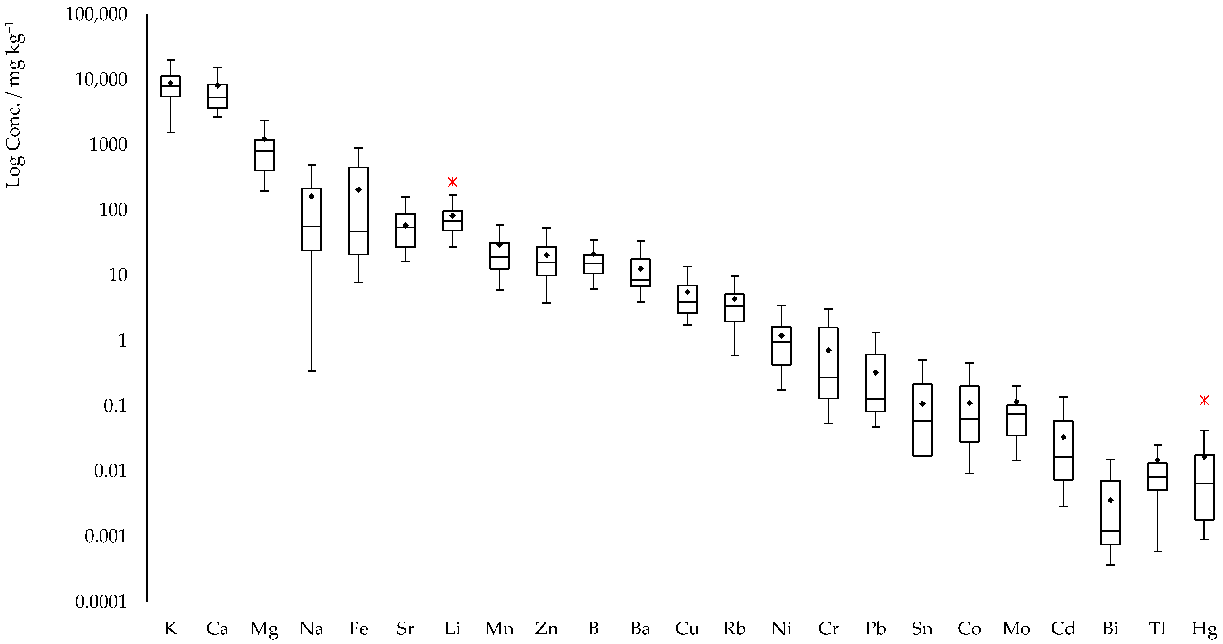 - Zafeiraki, E.; Kasiotis, K.M.; Nisianakis, P.; Machera, K. Macro and Trace Elements in Hemp (Cannabis sativa L.) Cultivated in Greece: Risk Assessment of Toxic Elements. Front. Chem. 2021, 9, 654308. [Google Scholar] [CrossRef]