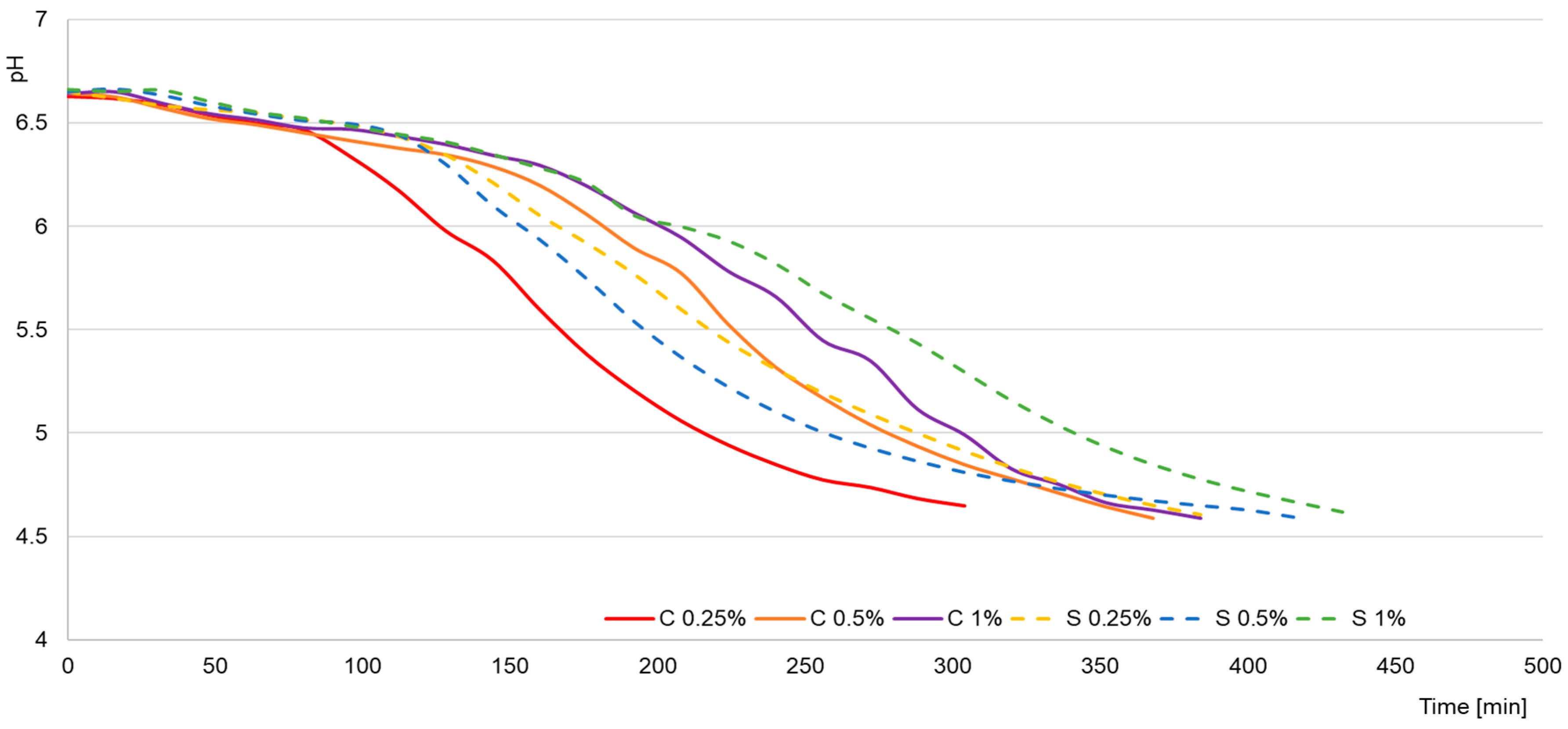 Figure 2, where the 0.25% C sample reached pH 4.6 after approximately 310 min, compared with 384 min for 0.25% S and 432 min for 1% S.