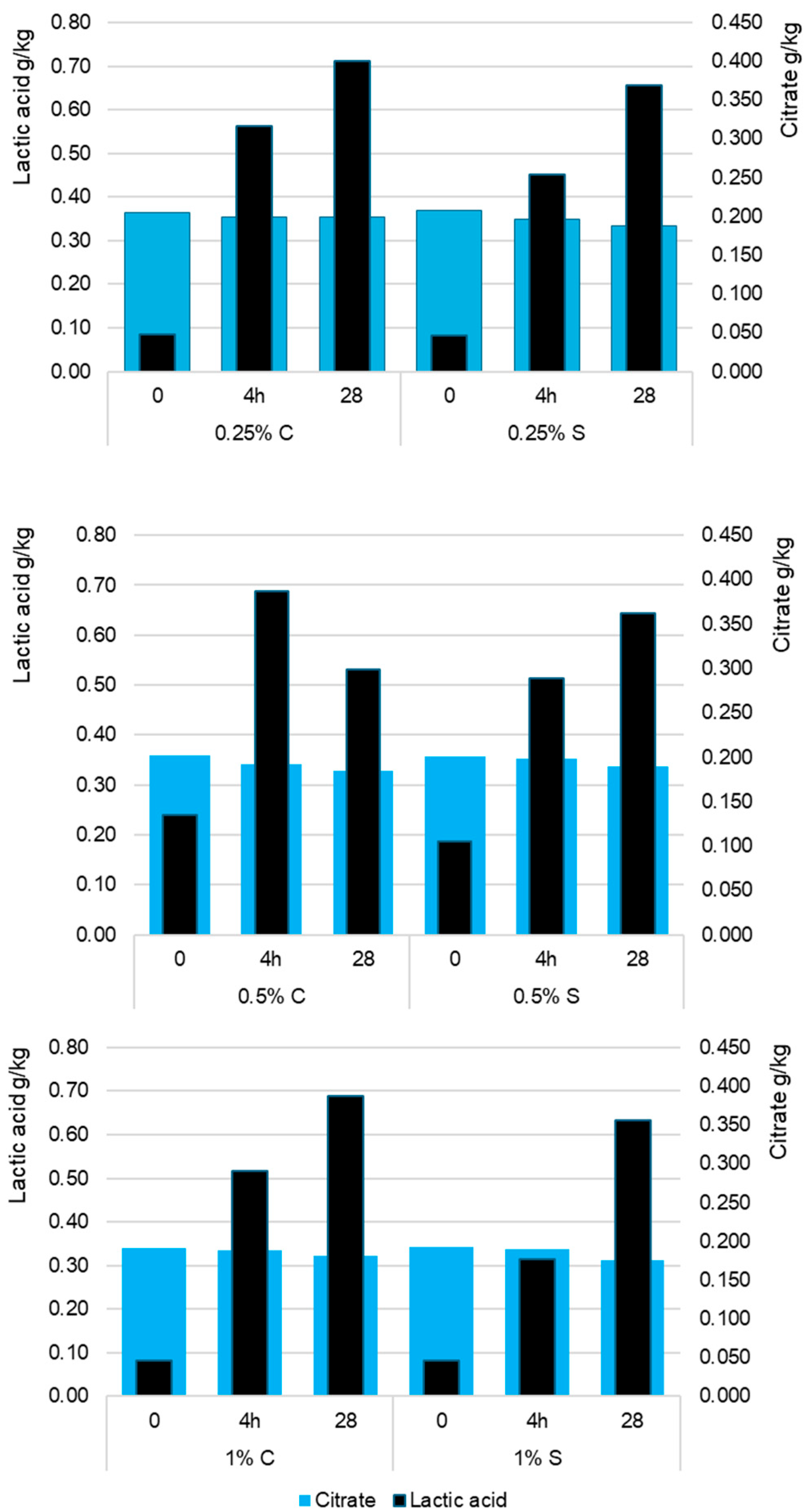 This was accompanied by an intense increase in the lactic acid concentration. In 0.25% C, it increased from 0.048 g/100 g to 0.316 g/100 g after 4 h and to 0.400 g/100 g on day 28, while in 0.25% S, the values were 0.046 g/100 g, 0.254 g/100 g, and 0.369 g/100 g, respectively. The observed relationships shown in