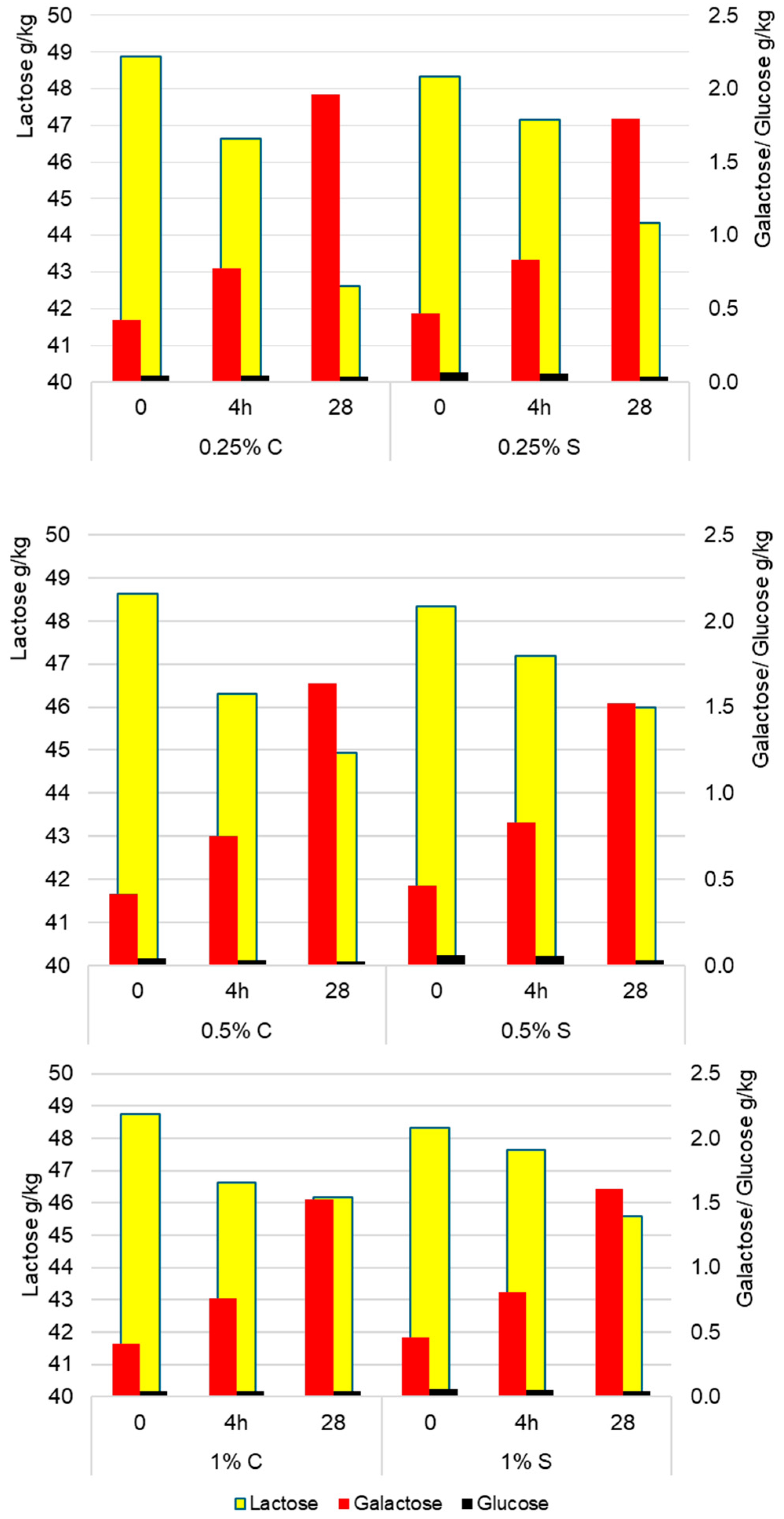 Figure 4, the highest rate of lactose conversion was found in yogurt with 0.25% scleroglucan, where after 28 days the lactose content decreased to 44.34 g/kg, and at the same time the highest accumulation of galactose (1.80 g/kg of product) and a minor reduction in glucose (0.03 g/kg). These results indicate that variants with a higher polysaccharide concentration were characterized by slower lactose hydrolysis, resulting in higher final lactose levels (45.99 g/kg for 0.5% S and 45.59 g/kg for 1% S) and lower galactose contents (1.52 g/kg and 1.61 g/kg, respectively) in