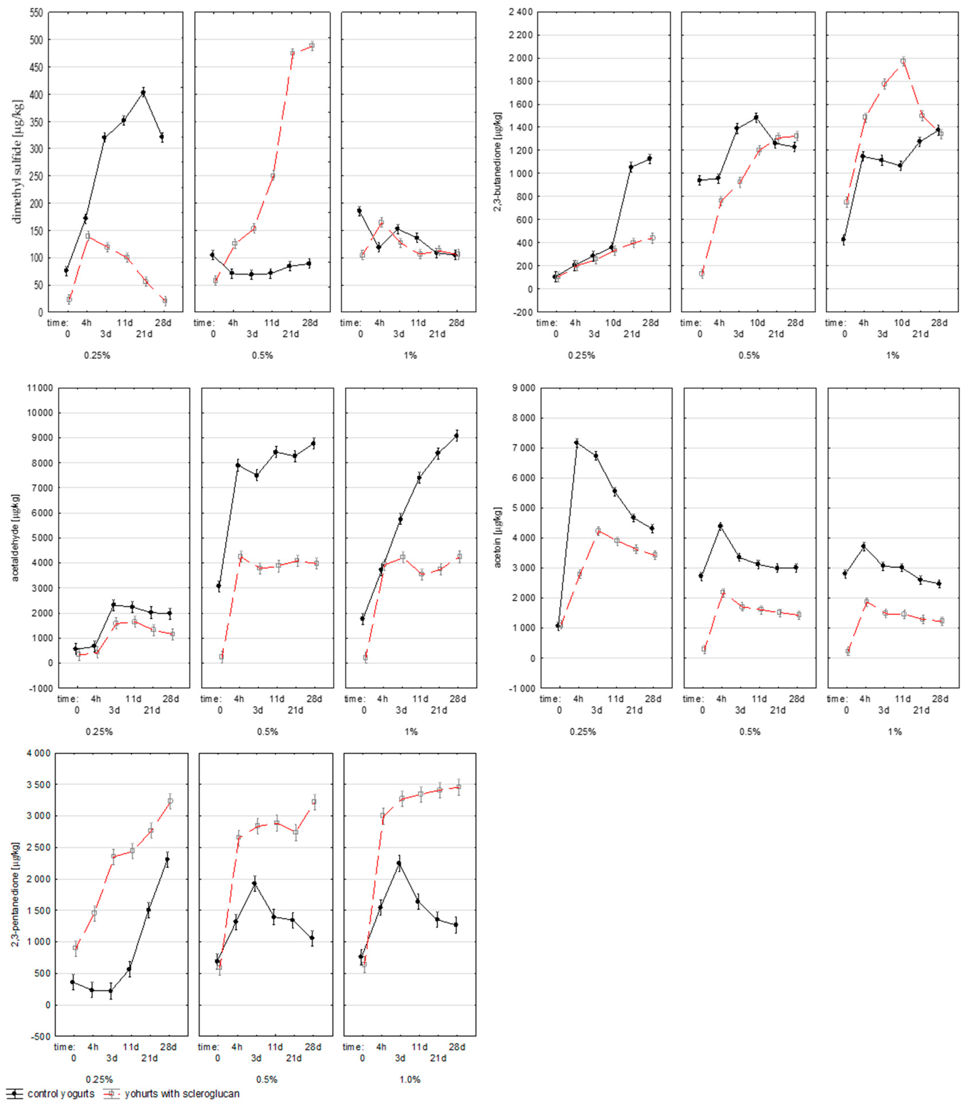 19]. In yogurts with 1.0% scleroglucan, a rapid initial increase was observed, followed by a lower final concentration compared with the control. This behavior suggests that the polysaccharide may bind aldehyde precursors or modulate bacterial enzyme activity, thereby reducing the synthesis and accumulation of acetaldehyde during fermentation and storage.