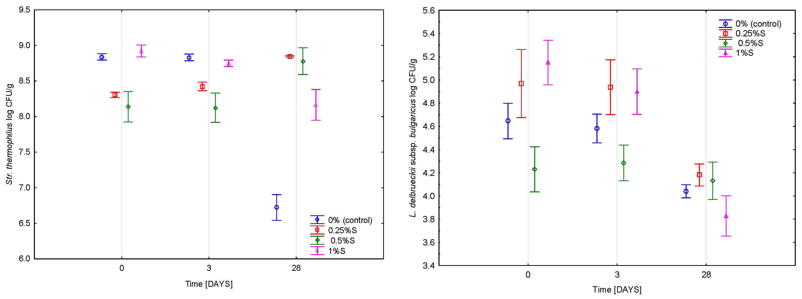 Figure 6, counts at day 28 reached approximately 4.3 log CFU/g in the control. A slight increase occurred in the 0.25% S variant (+0.1 log), whereas the 0.5% S sample showed a more pronounced decrease (0.67 log CFU/g). The 1% S variant remained comparable to the control.