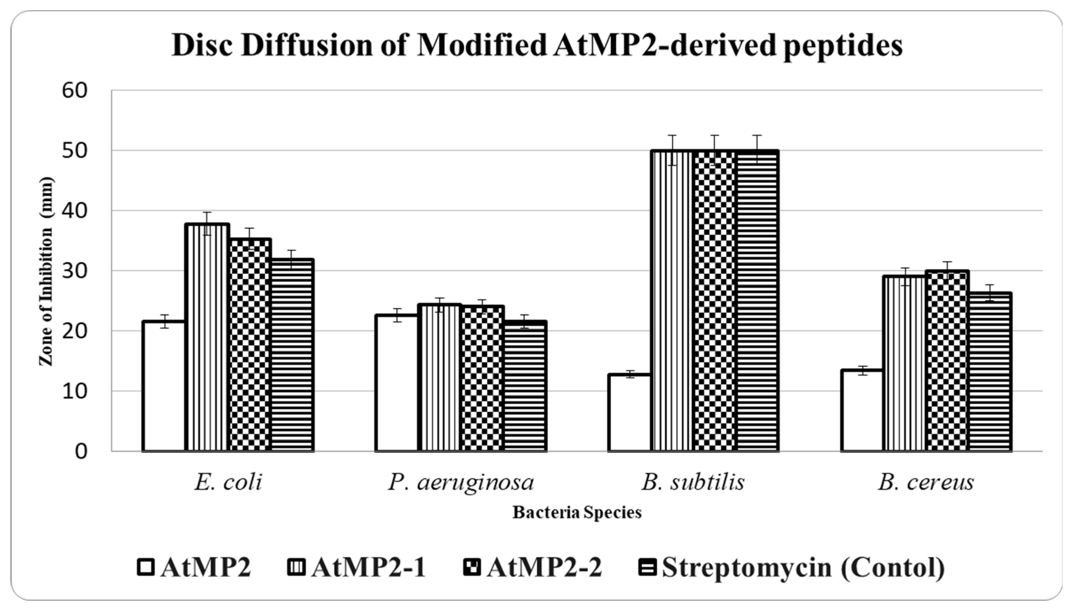 - Tincho, M.B.; Morris, T.; Meyer, M.; Pretorius, A. Antibacterial Activity of Rationally Designed Antimicrobial Peptides. Int. J. Microbiol. 2020, 2020, 2131535. [Google Scholar] [CrossRef]