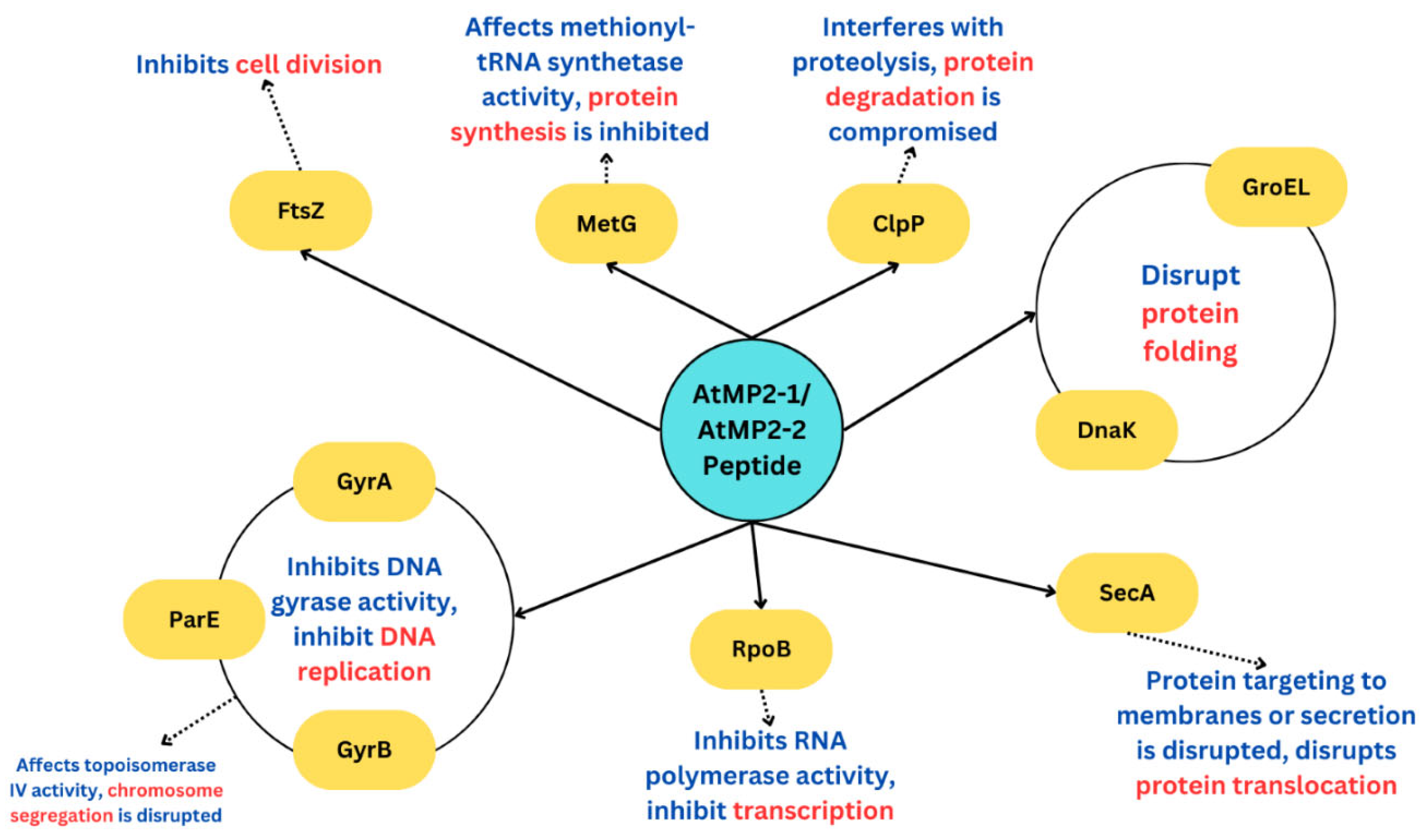 | DnaK | Chaperone protein aids in stress response and protein refolding | Stress Response and Protein Refolding | Disrupts stress response, preventing refolding of damaged proteins | [28] |