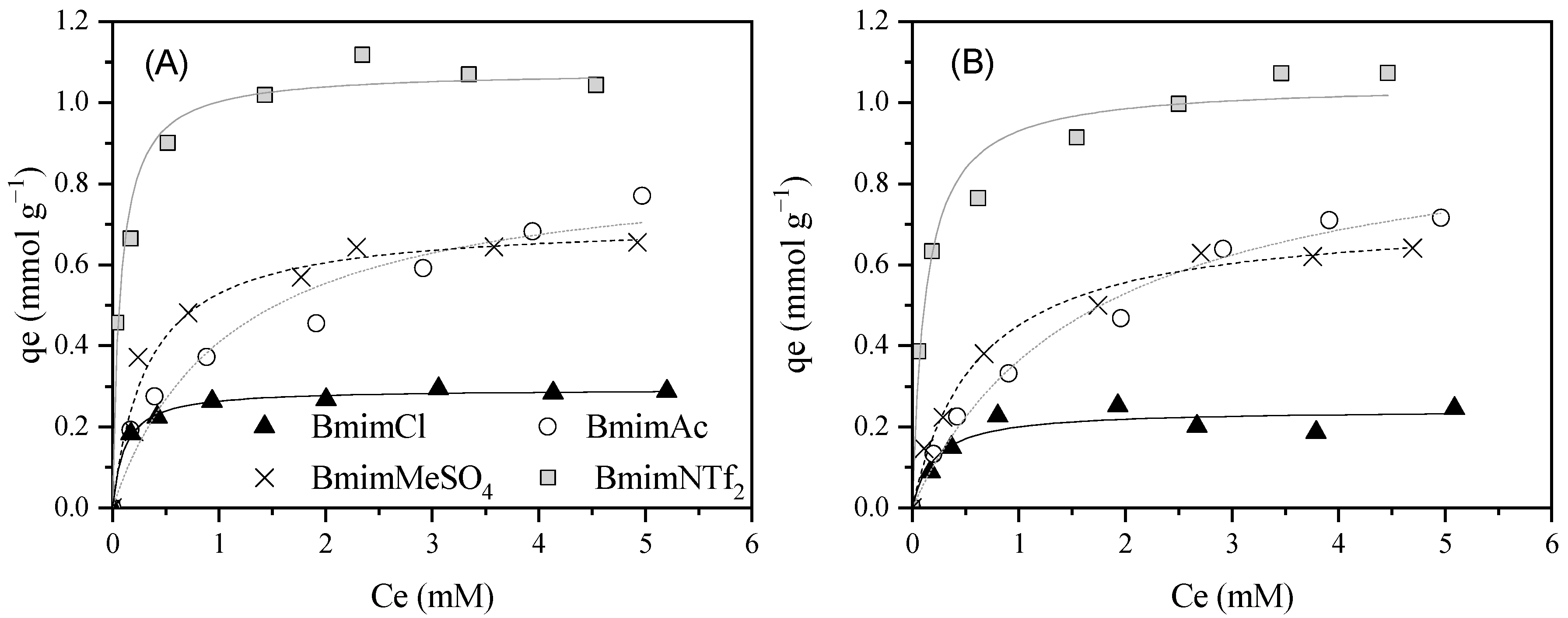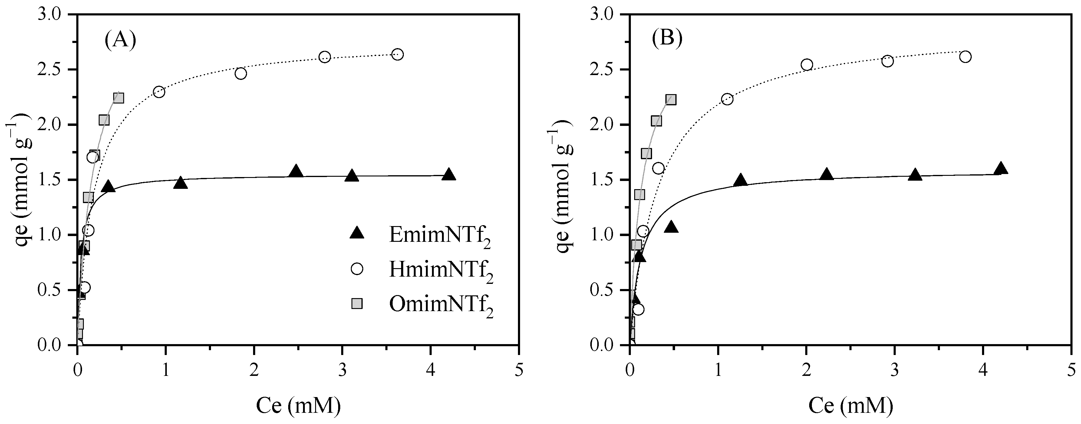 | BmimCl | Ordered mesoporous carbon CMK–3 and AC (Filtrasorb-300, Calgon) | Ordered mesoporous carbon: SBA-15 mixed with sucrose, pyrolysis (850 °C, 5 h) and washed with HF and water to remove the silica. Both materials were oxidized using HNO3 | ABET = 762–1078 m2 g−1 | C0 = 0–0.98 mM W = 250 mg L−1 T = 25–45 °C pH: 2.0–10.0 | qL = 0.23–0.87 | qL = 0.87 mmolBmim+ g−1 IL: BmimCl T: 25 °C AC: OMC oxidized with 6 M HNO3 | Zhang et al., 2018b [52] |