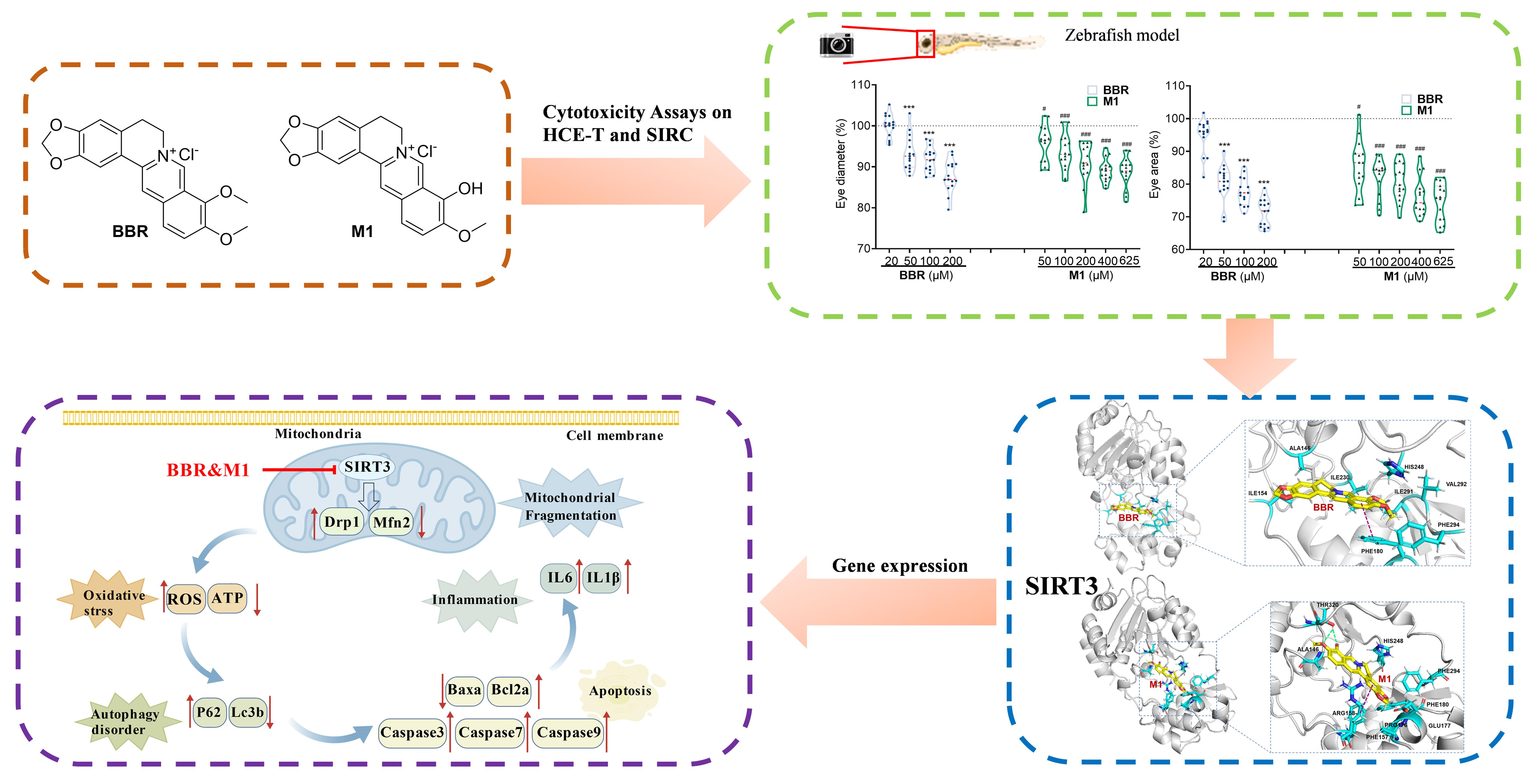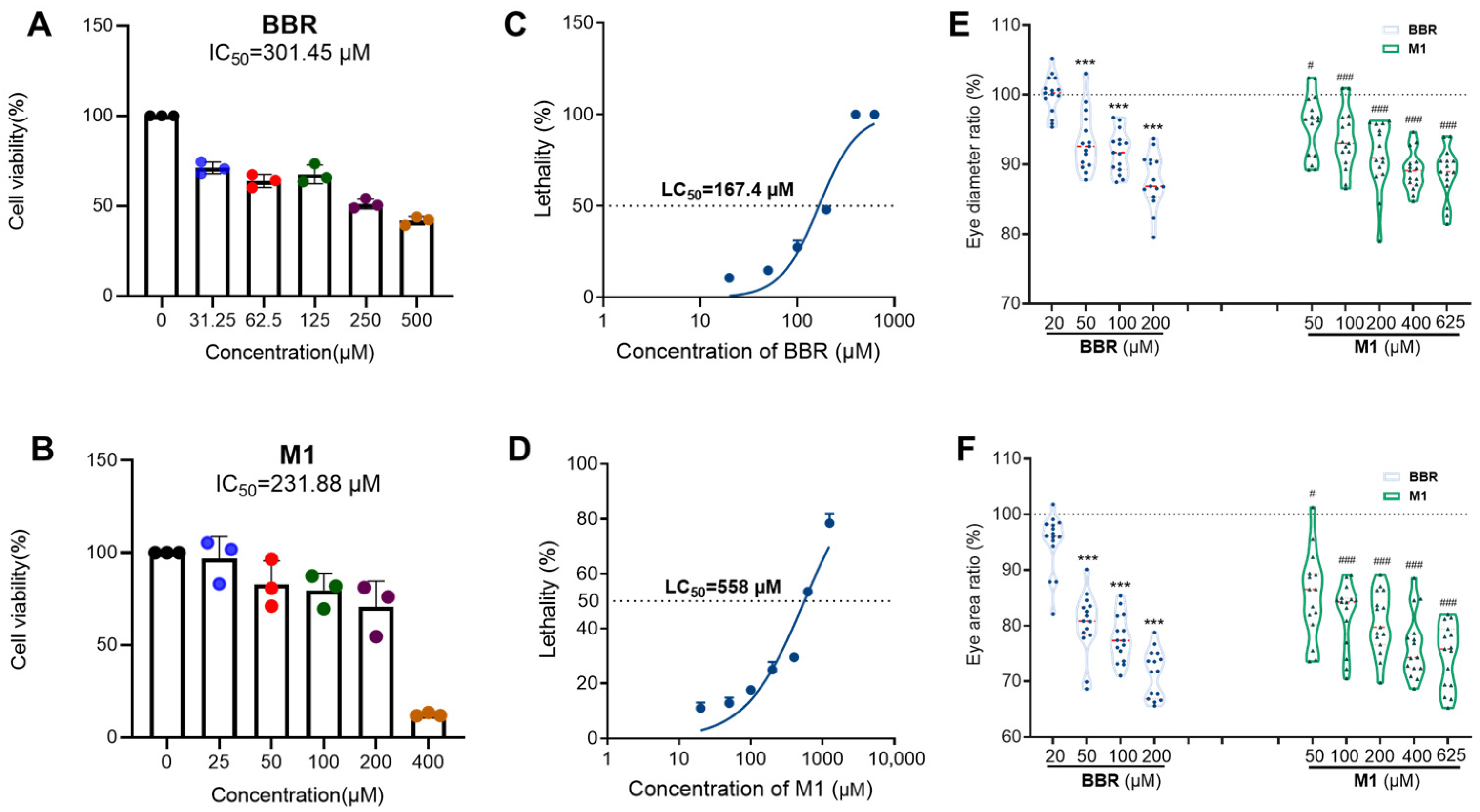 2.2.2. Ocular Toxicity of BBR and M1 in Zebrafish