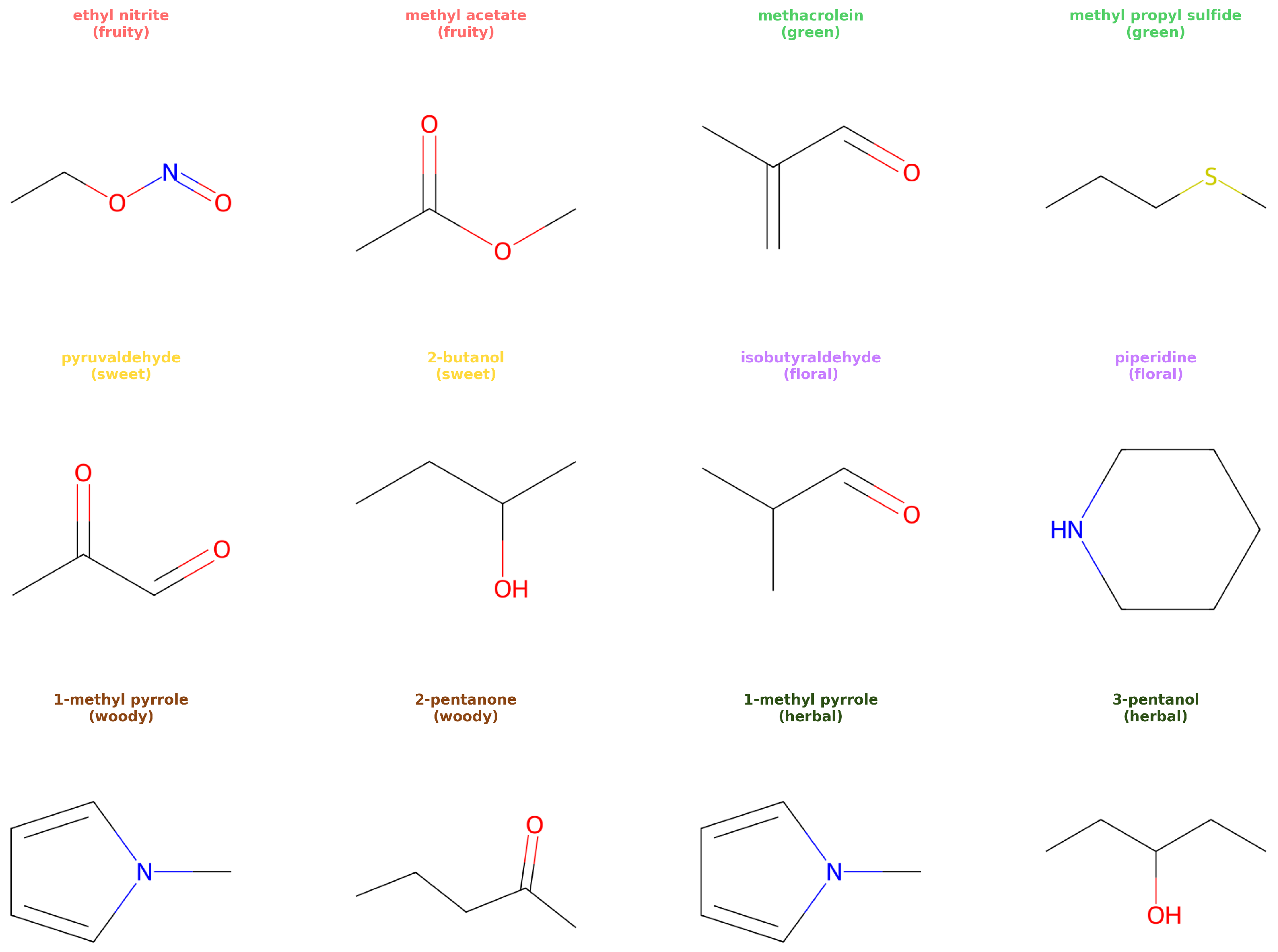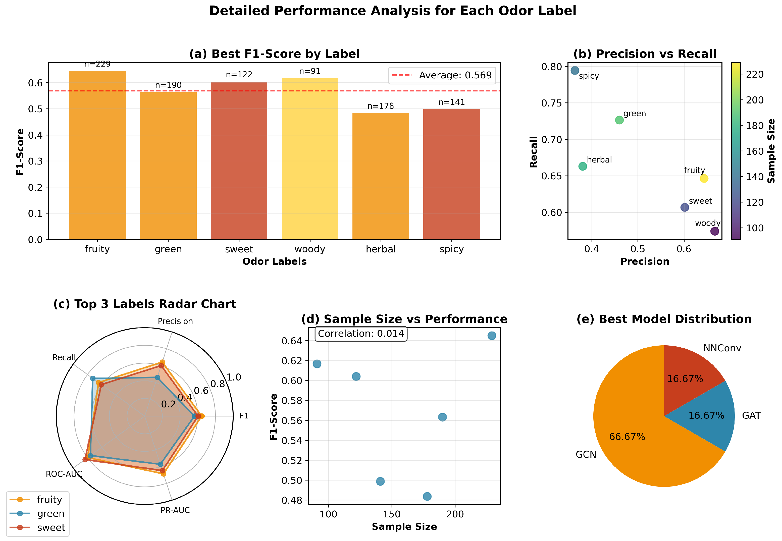 For each odor label, we analyze 20–30 correctly predicted test samples and aggregate fragment frequencies and average importance scores. This statistical approach ensures robust identification of consistently important fragments while accounting for molecular diversity within each odor category.