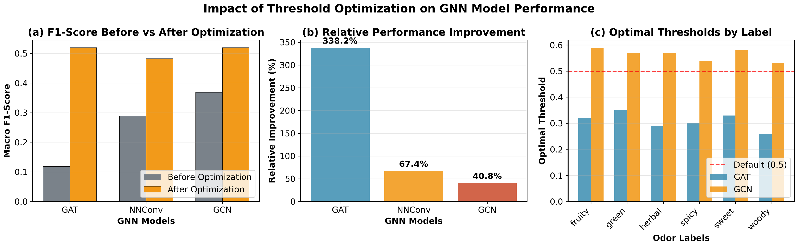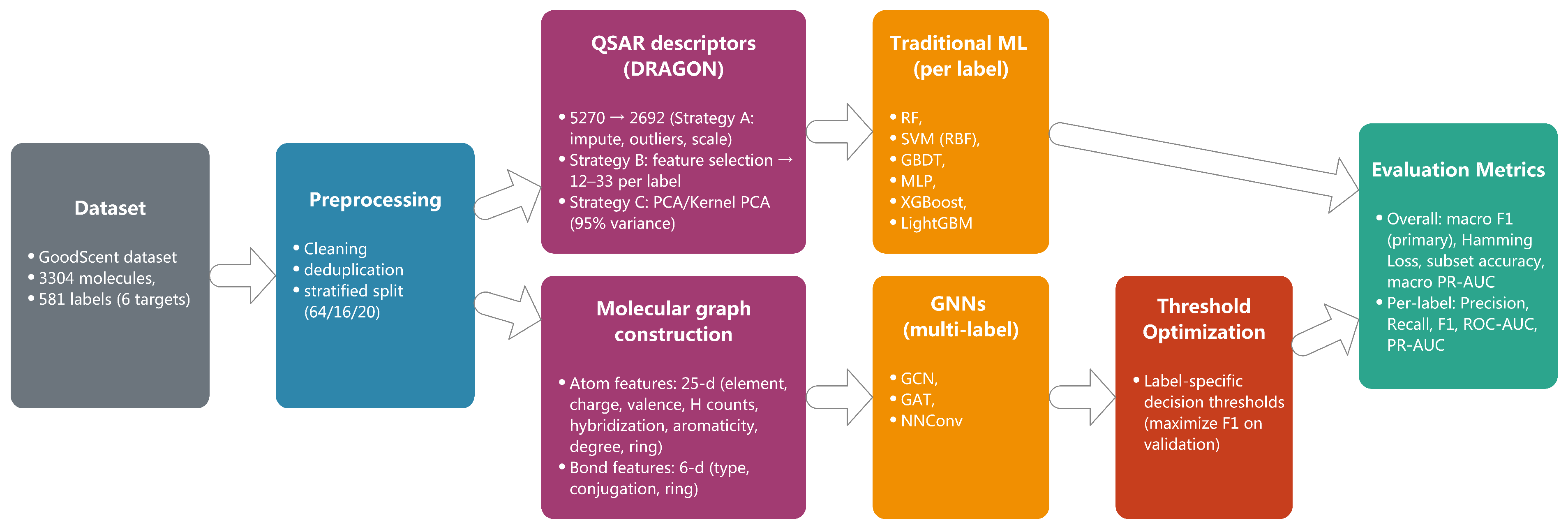 We evaluate three representative GNN architectures that capture different aspects of molecular graph learning through distinct message passing mechanisms. Each architecture processes the 25-dimensional node features and 6-dimensional edge features to learn molecular representations for odor prediction.
