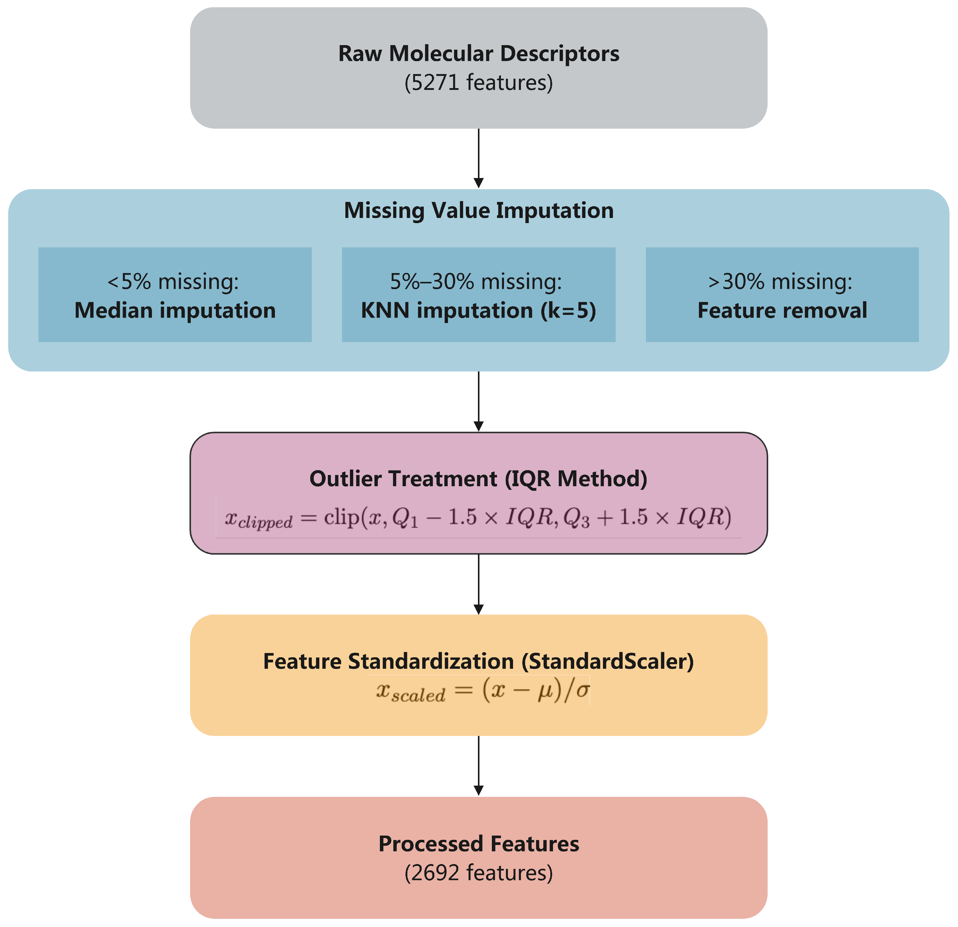 A molecular graph contains two types of features: node features and edge features. As for the node feature, each atom in the molecular graph is characterized by a 25-dimensional feature vector that captures both fundamental atomic properties and local chemical environment information. The feature representation systematically encodes atomic identity, electronic properties, and topological characteristics essential for molecular property prediction.