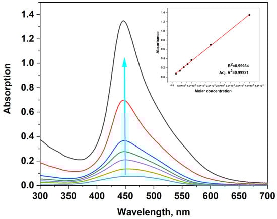 UV/VIS spectra of dye 4a, c = (0.2; 0.4; 0.6; 0.8; 1; 2; 4) × 10−5 M in TE buffer; the blue arrow indicates the increasing dye concentration. Inset: calibration curve showing absorbance as a function of dye concentration.