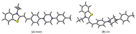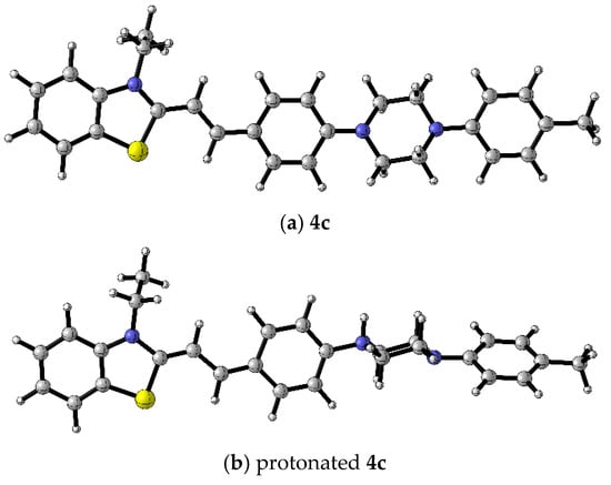 B3LYP/6-31+G(d,p) optimized geometries of (a) 4c and (b) protonated form of dye 4c. Color scheme: C—gray, S—yellow, H—white, N—blue [17].