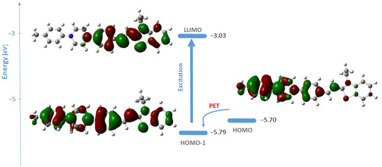 Energies and shape representation of HOMO-1, HOMO, and LUMO for the excited state of 4c in water from B3LYP/6-31+G(d,p) computations. The vertical arrow represents the electronic transition; the curved arrow indicates the possibility for photoinduced electron transfer [18,19].