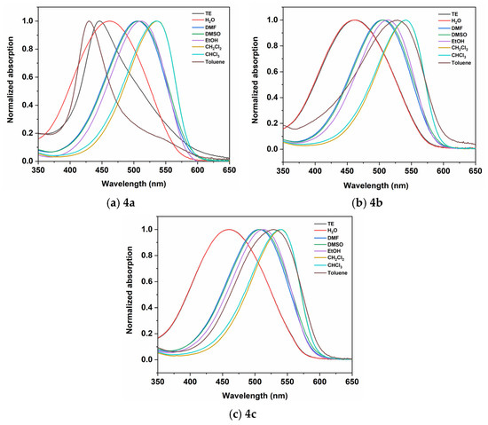 As mentioned, the theoretical calculations revealed that the longest-wavelength absorption corresponds to an intramolecular charge transfer (ICT) transition (Figure 3). The nature of this ICT transition implies a strong sensitivity to solvent polarity, suggesting that the position of the charge transfer (CT) band would be significantly influenced by the surrounding medium. To investigate the solvatochromic behavior of the dyes in detail, absorption spectra were recorded in solvents of varying polarity—H2O, DMF, DMSO, EtOH, CH2Cl2, CHCl3, and toluene. Solvatochromism is the phenomenon where the position and/or the intensity of the molecular electronic absorption or emission spectrum changes with the nature or polarity of the solvent [20]. This spectral shift occurs due to the different stabilization of the molecule’s ground and excited states by the surrounding media. The studied dyes are highly solvatochromic, showing both horizontal and vertical solvatochromism (Figure 4 and Figures S5–S7). The normalized spectra of dyes 4a, 4b, and 4c in various solvents are shown in Figure 4.
