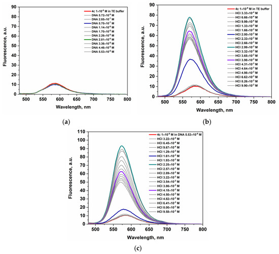 The titration of 4c-dye–DNA complex (Figure 9c) with HCl solution results in a stronger fluorescence response compared to dye 4c in the presence of acid (Figure 9b). Among the three dyes studied, the 4c-dye-DNA complex exhibits the most pronounced fluorescence enhancement in acidic conditions. The apparent average values of the increase in fluorescence intensities (Table 5) upon titration with hydrochloric acid of the dye-DNA complexes only partially characterize the fluorescence responses. The amount of emitted fluorescence is fully sufficient for bioanalytical purposes. In addition, we can emphasize that the fluorogenicity and operability of the dyes in the presence of both DNA and acids make them very promising markers in the study of malignant cell lines.