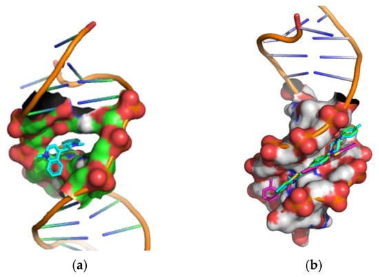 Cartoon-surface representation of dsDNA (PDB: 1G3X) in a complex with (a) thiazole orange; (b) styryl dyes 4a (green), 4b (magenta), 4c (cyan).