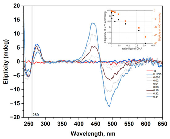 It was important to establish whether the dyes indeed interact with nucleic acids. To verify this, we examined the interaction of dye 4c with B-DNA using circular dichroism (CD) spectroscopy, a valuable method for studying the binding of small molecules to chiral macromolecules such as nucleic acids (NA). Circular dichroism titration of dye 4c with B-DNA was performed. The CD spectra shown in Figure 11 provide clear evidence of complex formation, even though the fluorescence spectra of the 4c–DNA complexes (Figure 9a) show little to no change. During the titration experiment, the nucleotide concentration was kept constant while the dye was gradually added to the NAs solution. The CD spectra of dye 4c interacting with dsDNA are presented in Figure 11. The CD spectrum of the B-DNA structure at pH 7.5 has a positive band around 275 nm and a negative band around 249 nm. Dye 4c itself does not show any characteristic CD in its absorption interval. The induced CD signal (ICD) observed in the absorption band of a nonchiral ligand is clear evidence of interaction with NA. The appearance of exciton-coupled bisignate ICD bands is evidence of the dye interacting with the B-DNA. The form of the ICD strongly supports binding along the groove of the polynucleotides or aggregation in the groove of the NA.