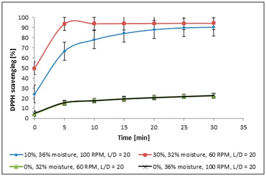 Besides the analysis of impact of additive on free radical scavenging activity, the production parameters used during sample preparation may also impact the biological property. The studies allowed us to analyze the influence of moisture and screw rotation speed (RPM) on their antioxidant activity (Figure 2).