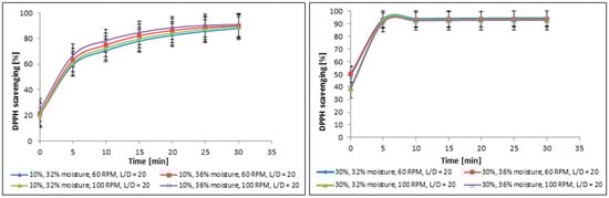DPPH-scavenging activities obtained for functional food products enriched with 10% and 30% of cricket powder: moisture, RPM—screw rotation speed, and L/D—length-to-diameter ratio.