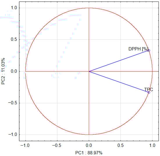 Projection of variables: DPPH (2,2-diphenyl-1-picrylhydrazyl) and TPC (total phenolic content) on the PC1 and PC2 score plot.
