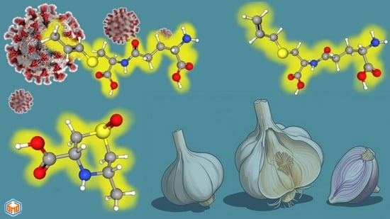 - Del Rayo Camacho-Corona, M.; Camacho-Morales, A.; Góngora-Rivera, F.; Escamilla-García, E.; Morales-Landa, J.L.; Andrade-Medina, M.; Herrera-Rodulfo, A.F.; García-Juárez, M.; García-Espinosa, P.; Stefani, T.; et al. Immunomodulatory Effects of Allium sativum L. and Its Constituents against Viral Infections and Metabolic Diseases. Curr. Top. Med. Chem. 2022, 22, 109–131. [Google Scholar] [CrossRef]