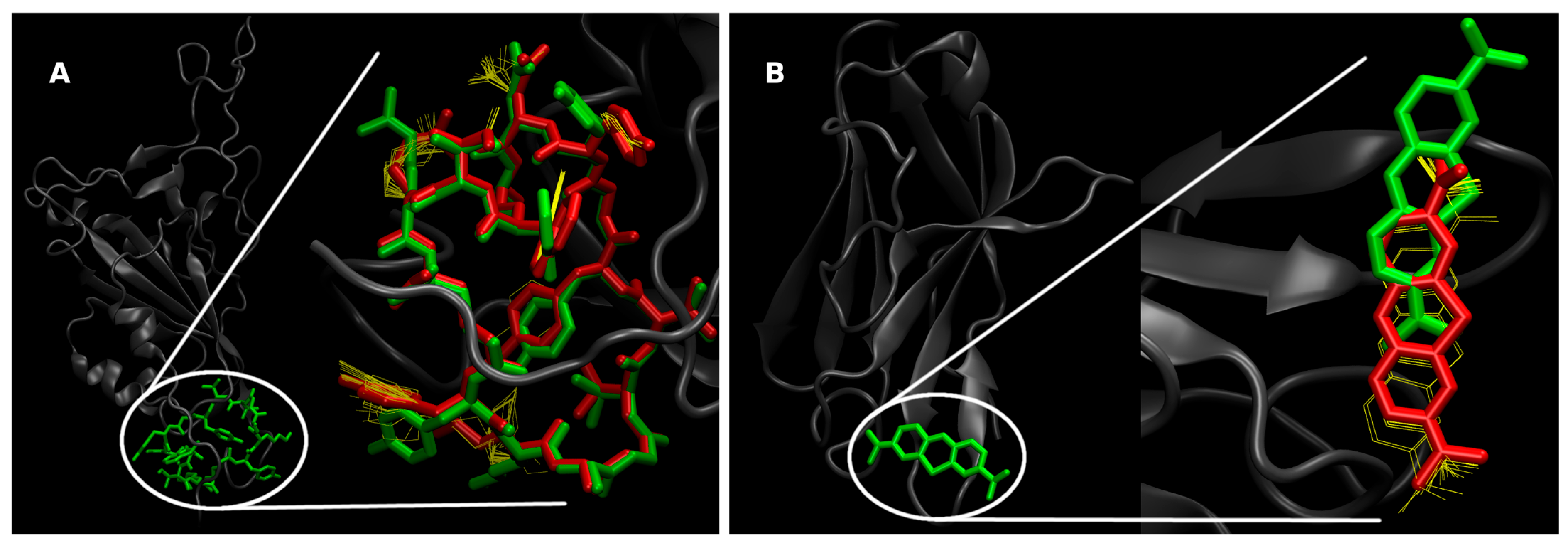 | L42: 9,12,15-Octadecatrienoic acid (α-Linolenic acid) | Interrupts the binding, adsorption, and entry stages of Zika virus replication cycle [37] | Anti-obesity, antidiabetic, cardiovascular-protective, anti-inflammatory, anticancer, neuroprotection, and antibacterial [38,39] Anti-hypercholesterolemic [40] |