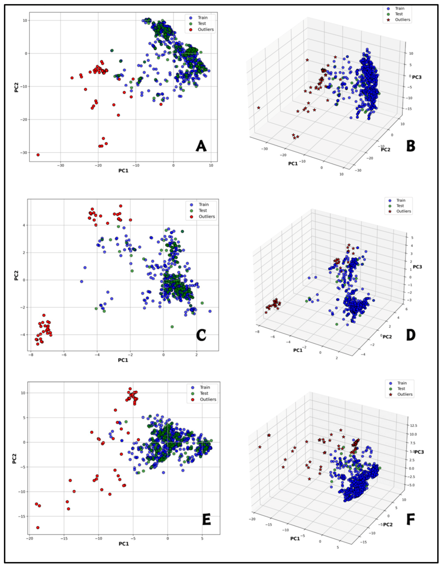 Figure 2. Applicability domain analysis for generated ML-QSAR models, training (blue), test (green) and outliers (red). (A,B) show 2D and 3D PCA of the PubChem FP prediction model; (C,D) show 2D and 3D PCA of the substructure FP prediction model; (E,F) show 2D and 3D analyses of MACCS FP prediction model.
