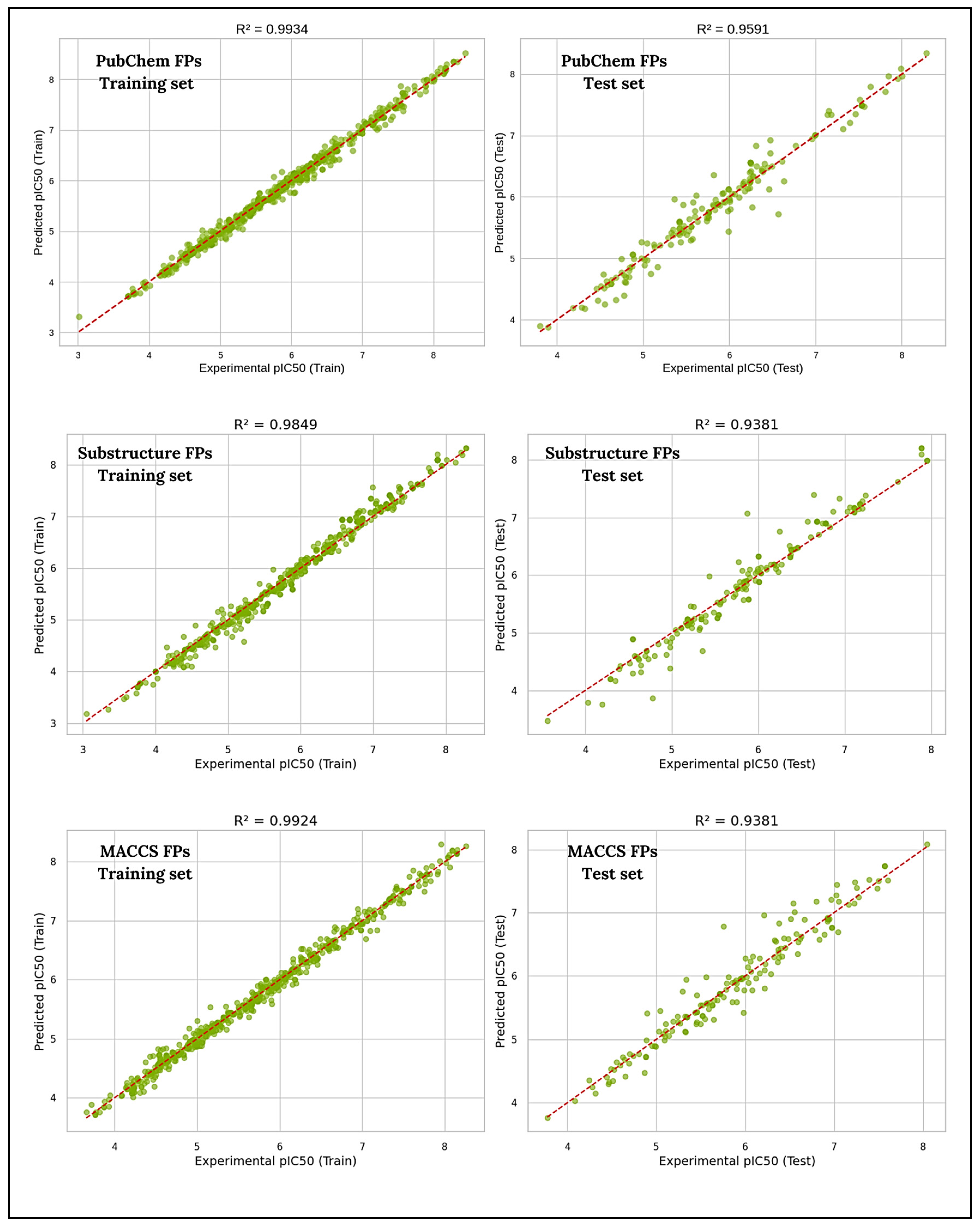 Based on the identified significant molecular features and optimal hyperparameter, a random forest regression model was subsequently trained and evaluated on both training and testing subsets for each fingerprint type to develop three robust ML-QSAR models, including PubChem, Substructure and MACCS fingerprints, to relate the molecular features with pIC50 values.