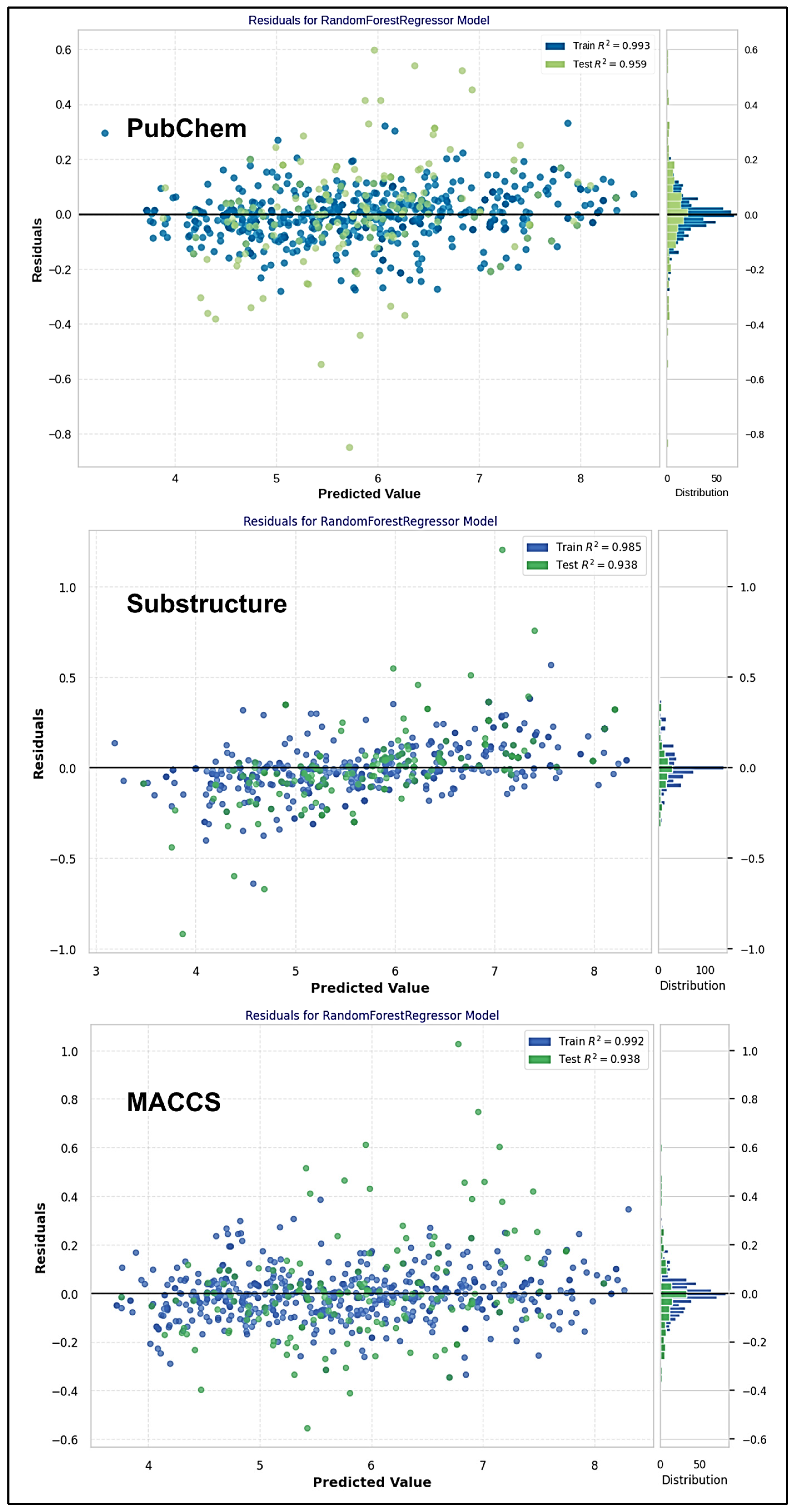 The residual plots were used to assess the predictive quality of the random forest regressor (RFR) models, as illustrated in Figure 4. The plots display residuals (y-axis) against the predicted values (x-axis) of all QSAR models, providing a visual representation of predictive errors across different ranges of predictive values [36]. The plots consist of a set of columns which display residuals from both the training and test datasets, where the training set is displayed in blue color, and the test set is displayed in green. The R2 values shown in the plot provide a quantitative assessment of the model performance, with higher values indicating better fit and more accurate predictions.